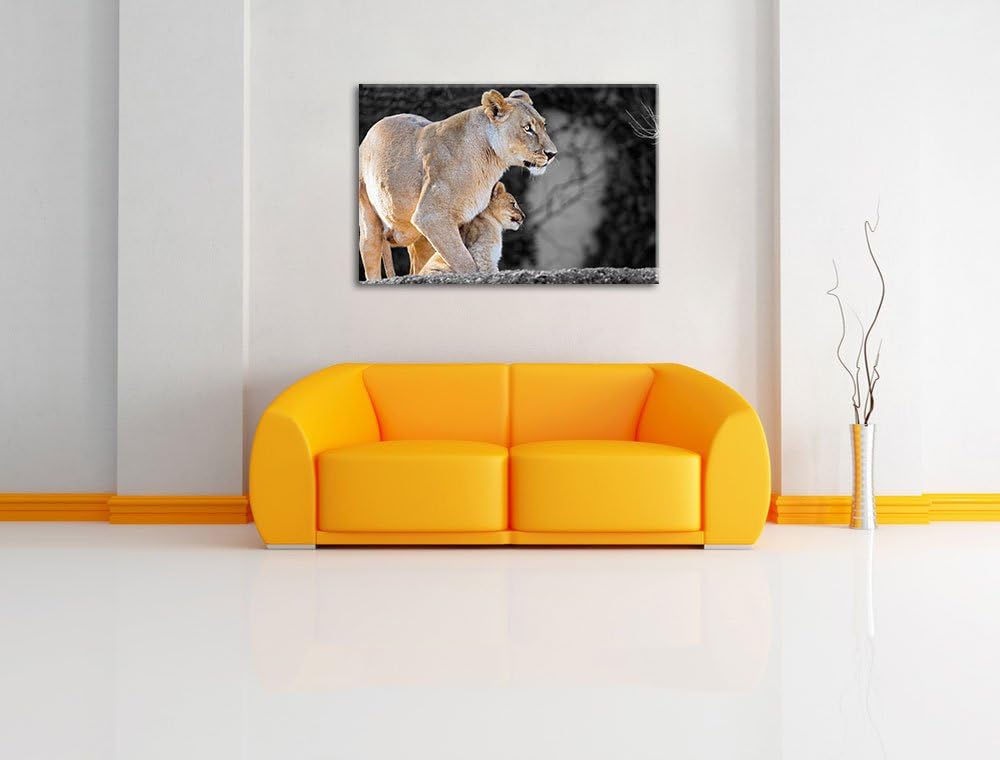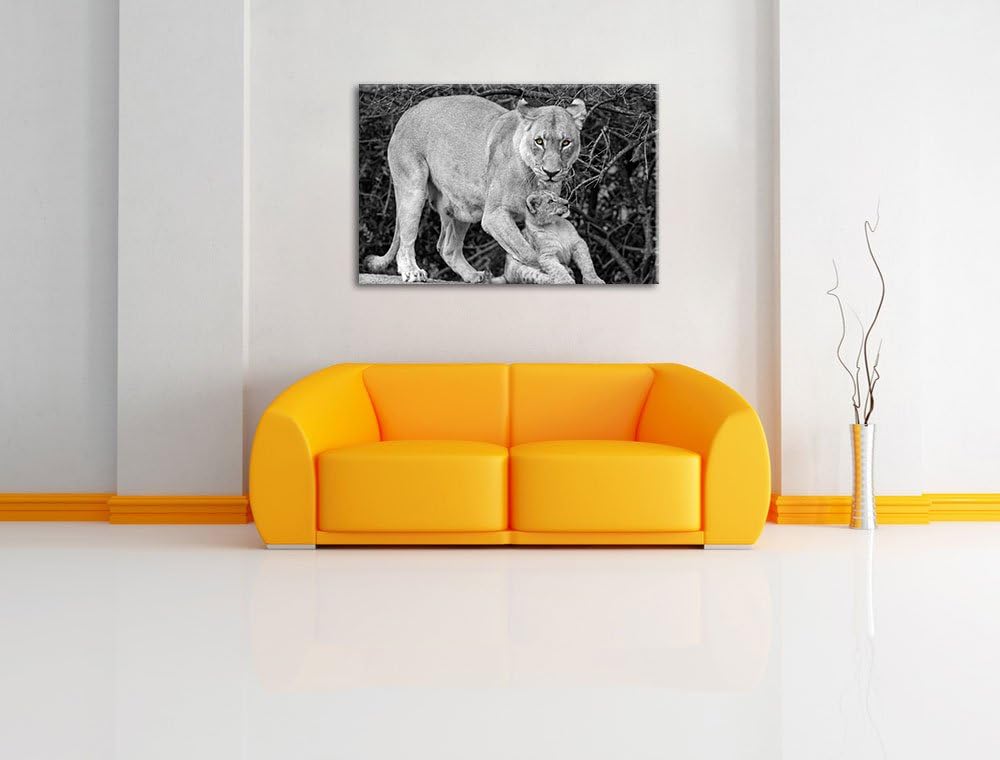 liebevolle Löwenmutter mit Jungtier schwarz/weiss auf Leinwand, XXL riesige Bilder fertig gerahmt mi