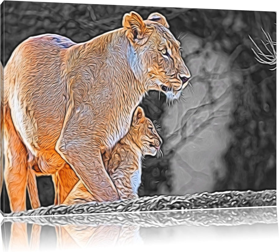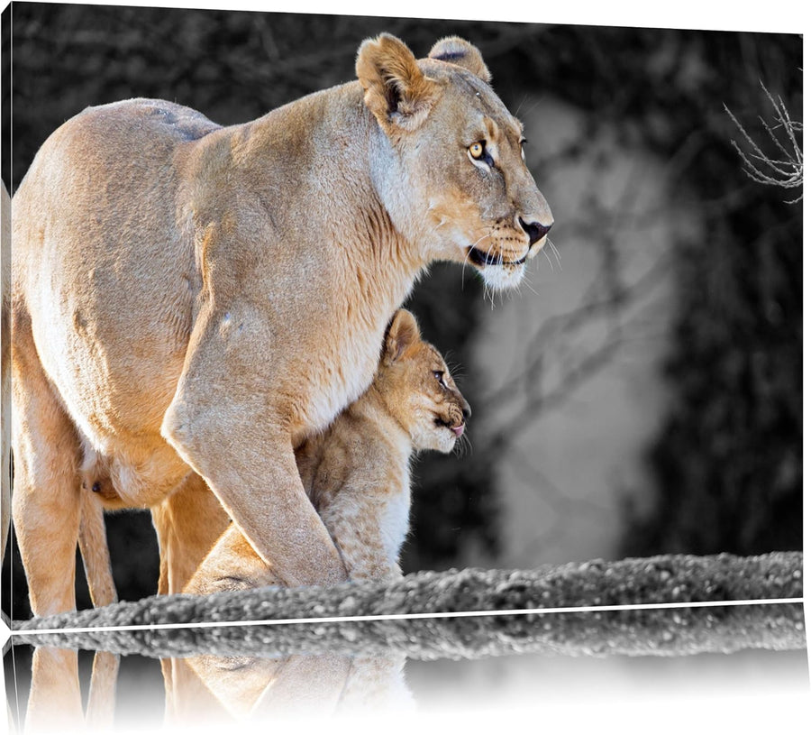 lieber Löwe mit Jungtier Deluxe Format: 100x70 cm auf Leinwand, XXL riesige Bilder fertig gerahmt mi