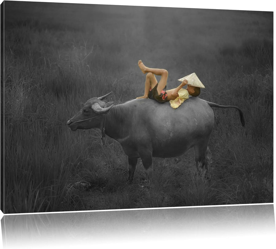 liegendes Kind auf Wasserbüffel schwarz/weiss Format: 100x70 auf Leinwand, XXL riesige Bilder fertig