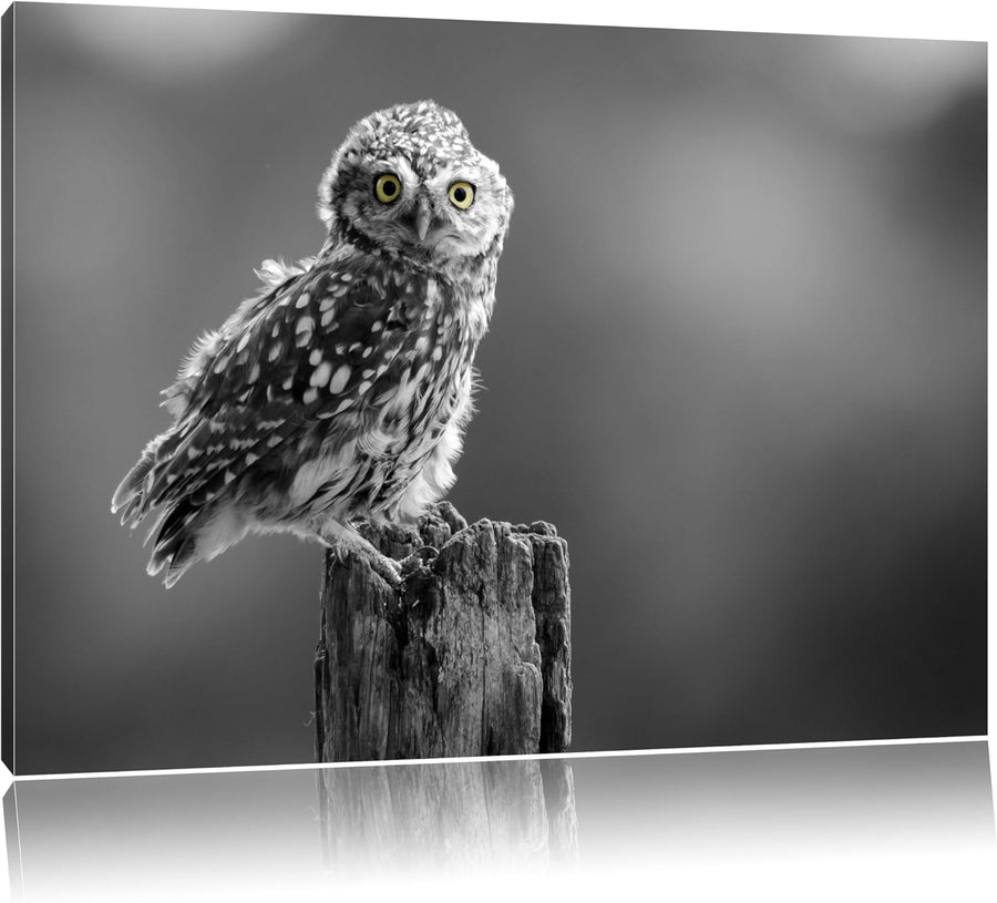 lustige Eule auf Baumstumpf schwarz/weiss Format: 100x70 auf Leinwand, XXL riesige Bilder fertig ger