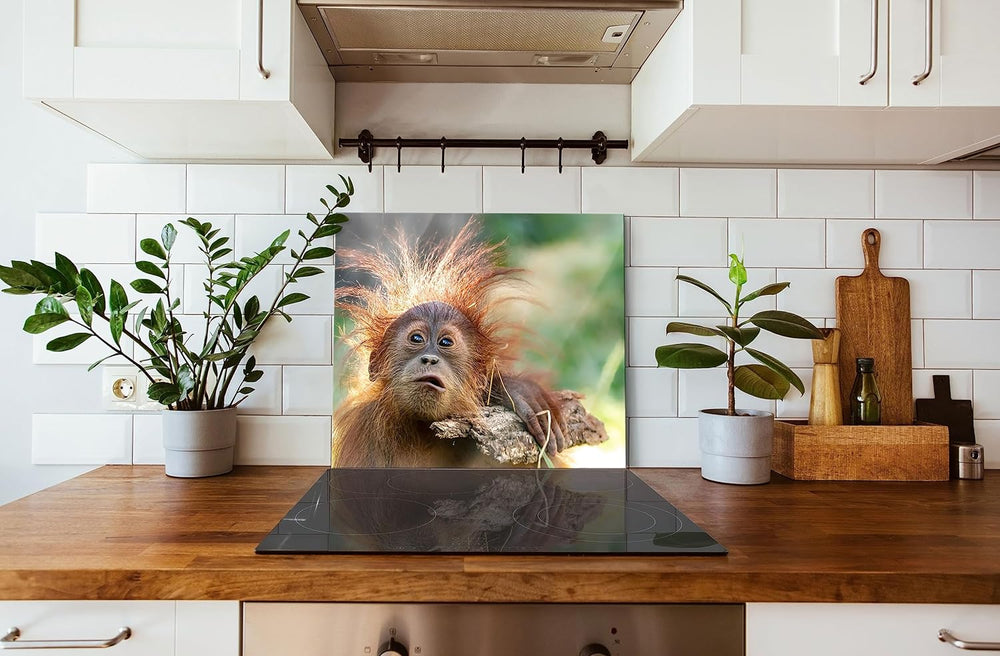 Lustiger Baby Orang-Utan mit Rinde Herdabdeckplatte & Spritzschutz aus Echtglas | Für Herd-Kochfelde