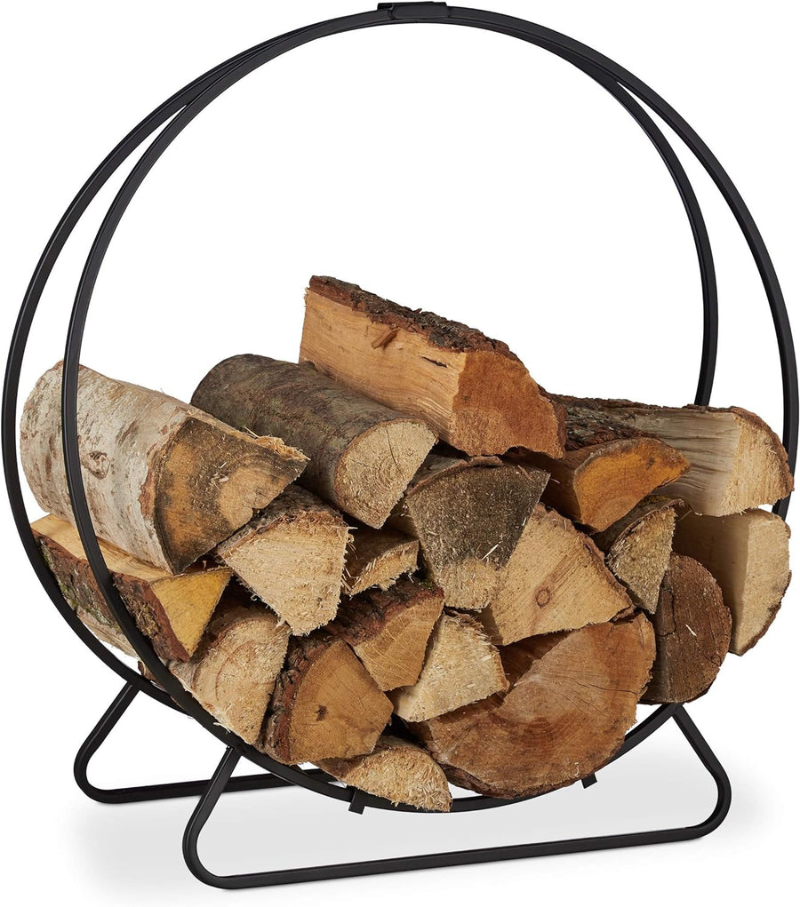 Relaxdays, schwarz Kaminholzregal, rund, Holzscheite Stapelhilfe, aus Stahl, innen, Brennholzregal,