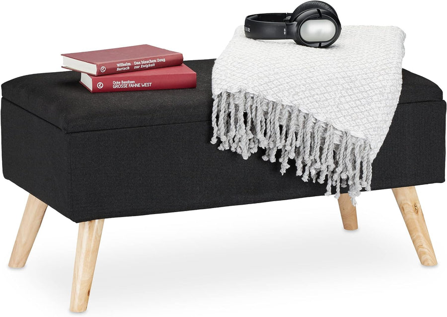Relaxdays, schwarz Sitzbank mit Stauraum, gepolstert, Holzbeine, Truhenbank Stoffbezug, H x B x T: 3