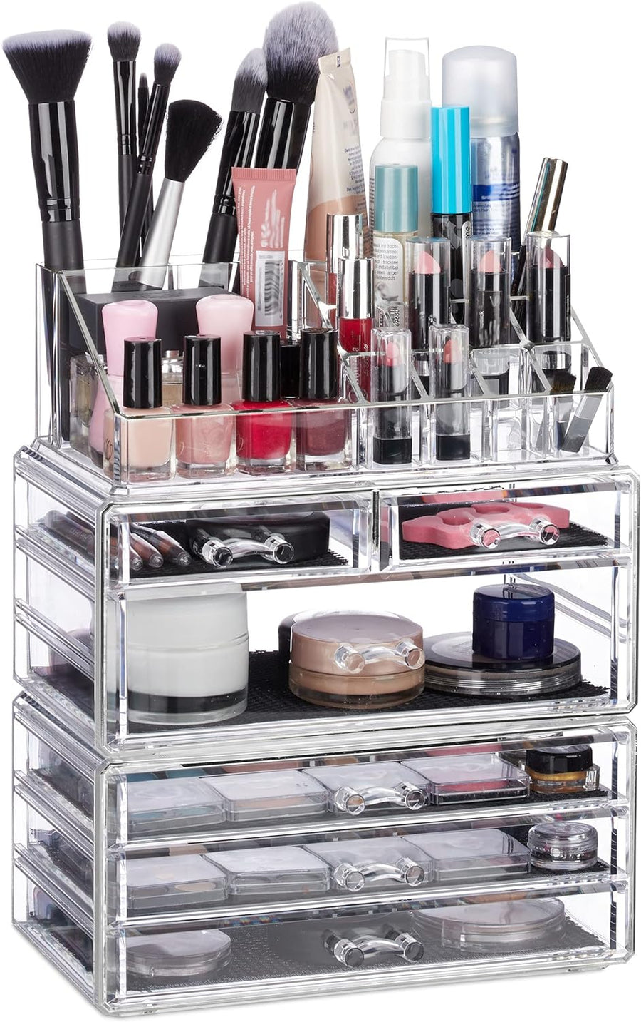 Relaxdays, transparent Kosmetikorganizer mit 6 Schubladen, 22 Fächer Make Up Organizer, Schmink-Aufb