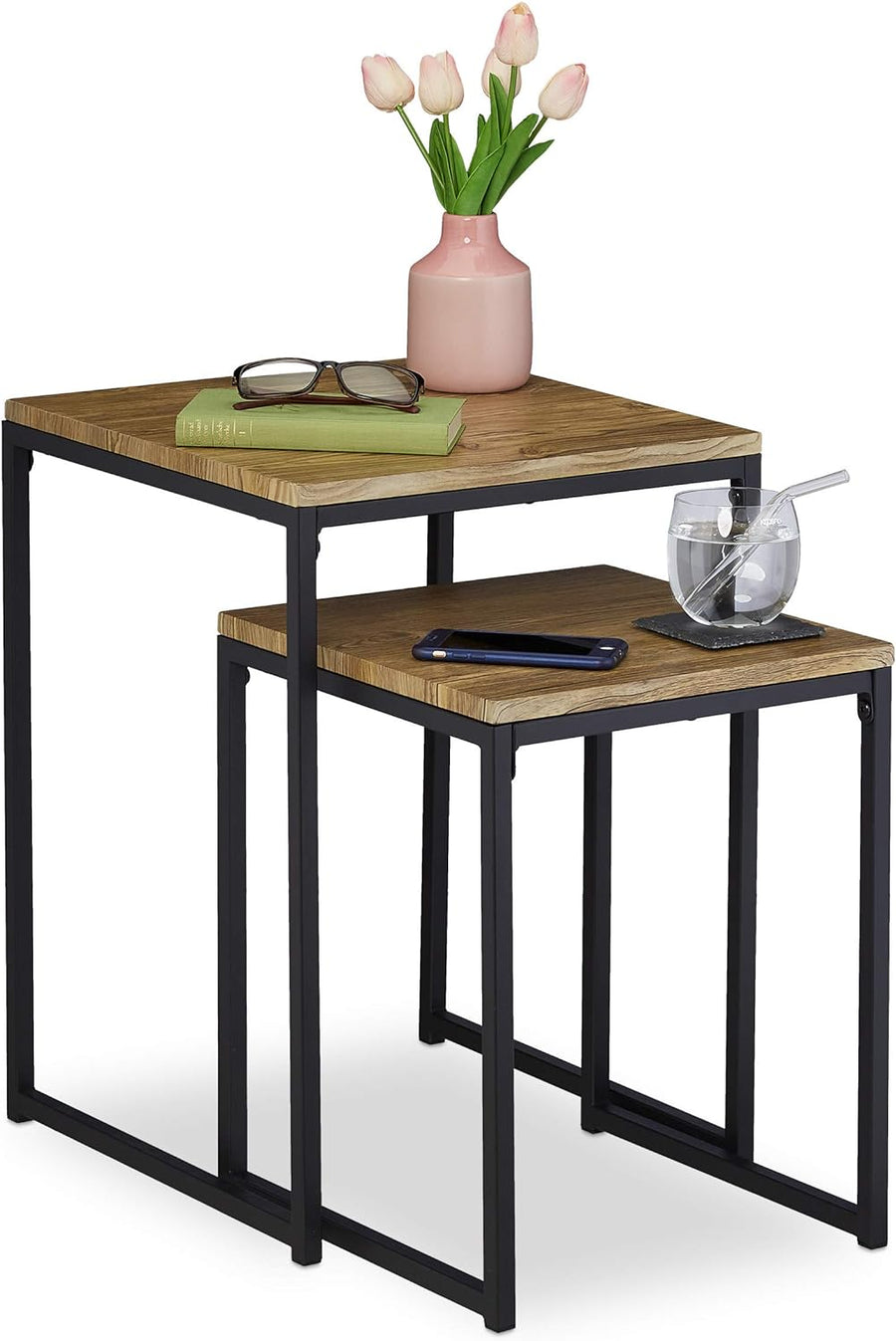 Relaxdays, stapelbar, Satztisch 2 Grössen, quadratisch, Metall, Holzoptik/schwarz, Eisen, Beistellti