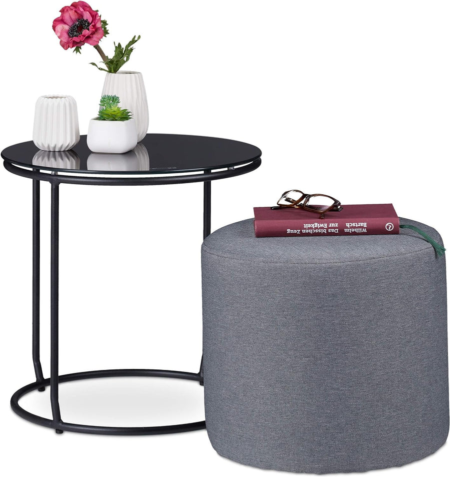 Relaxdays, schwarz und grau Beistelltisch mit Hocker, rund, Couchtisch und Pouf Kombination, platzsp