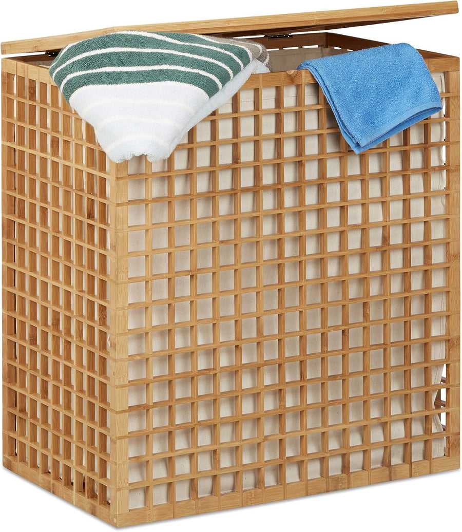 Relaxdays Wäschekorb Bambus mit Deckel, rechteckiger Wäschesammler, 2 Fächer, 95 l Volumen, faltbare