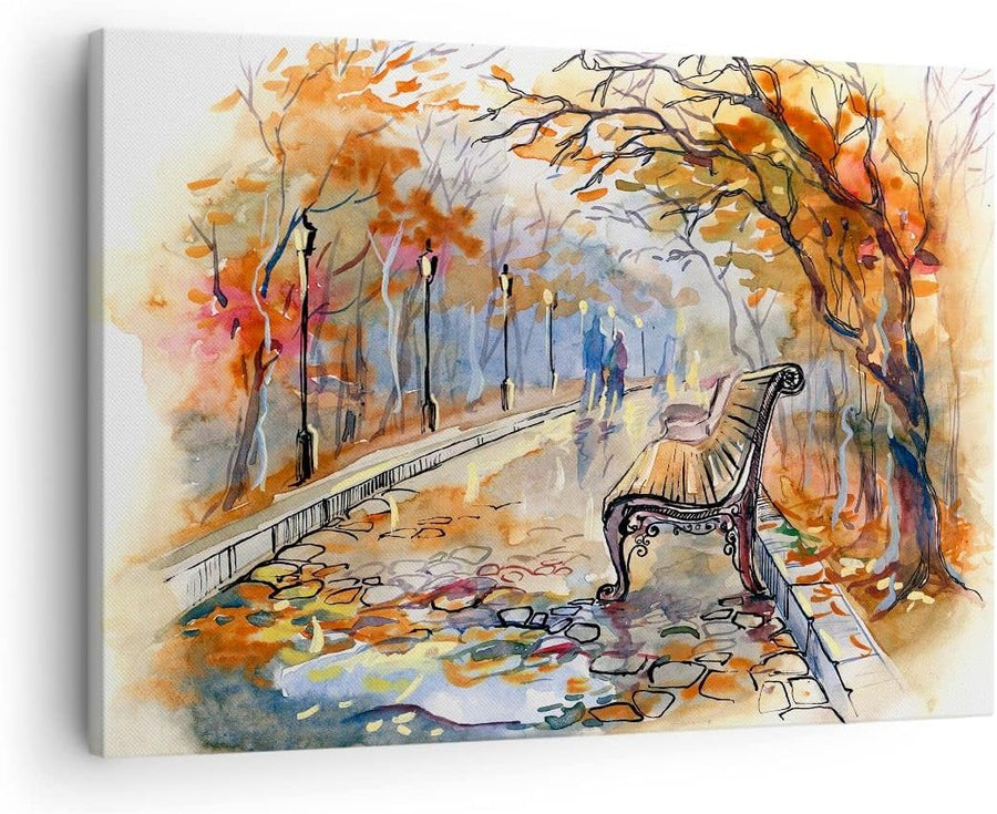 ARTTOR Bilder auf Leinwand Path Bench Herbst Frau Leinwandbild 70x50cm Wandbilder Dekoration Wohnzim