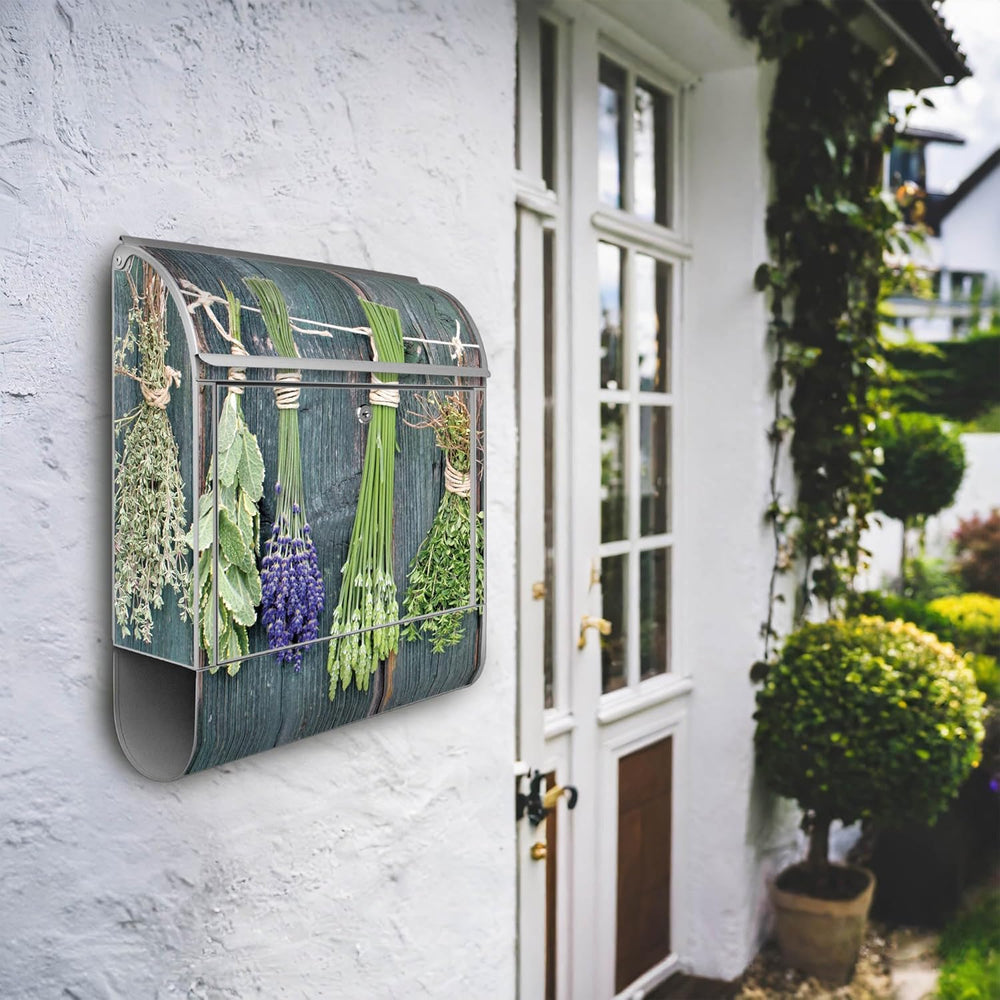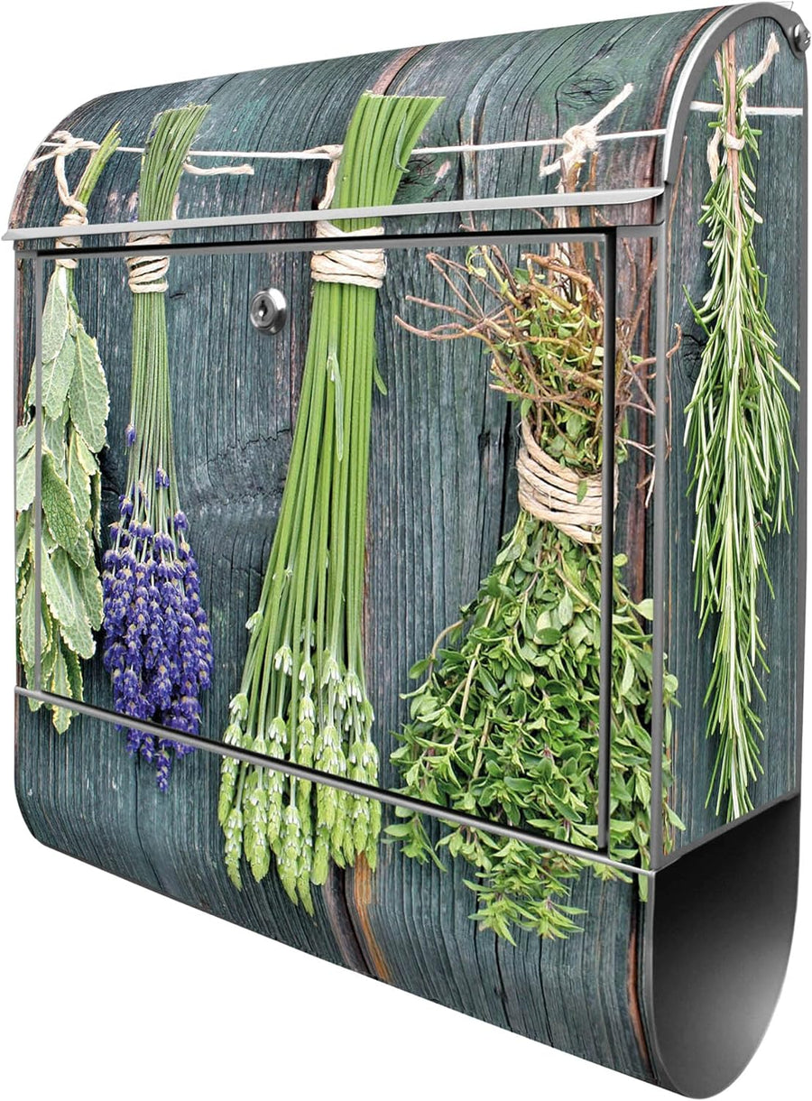 banjado® Design Briefkasten mit Motiv Acht Kräuter 39x47x14cm & 2 Schlüssel - Briefkasten Stahl Silb