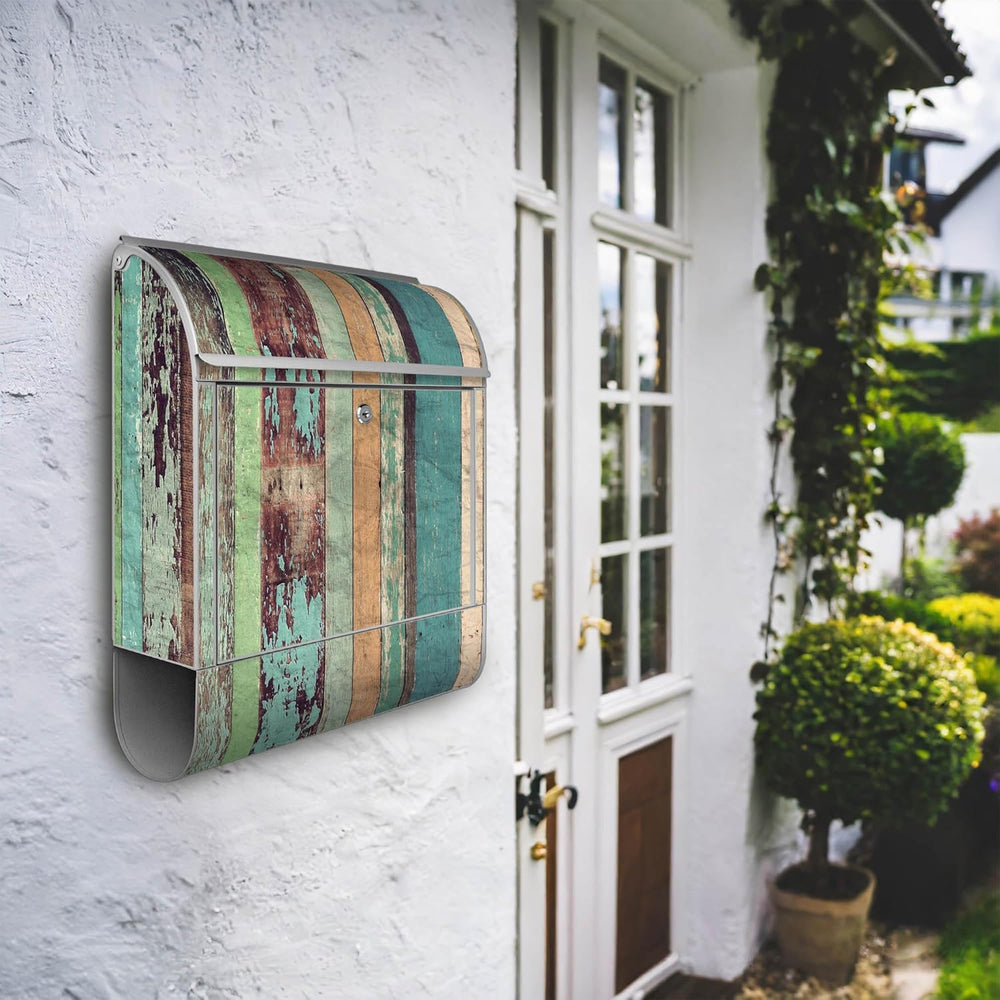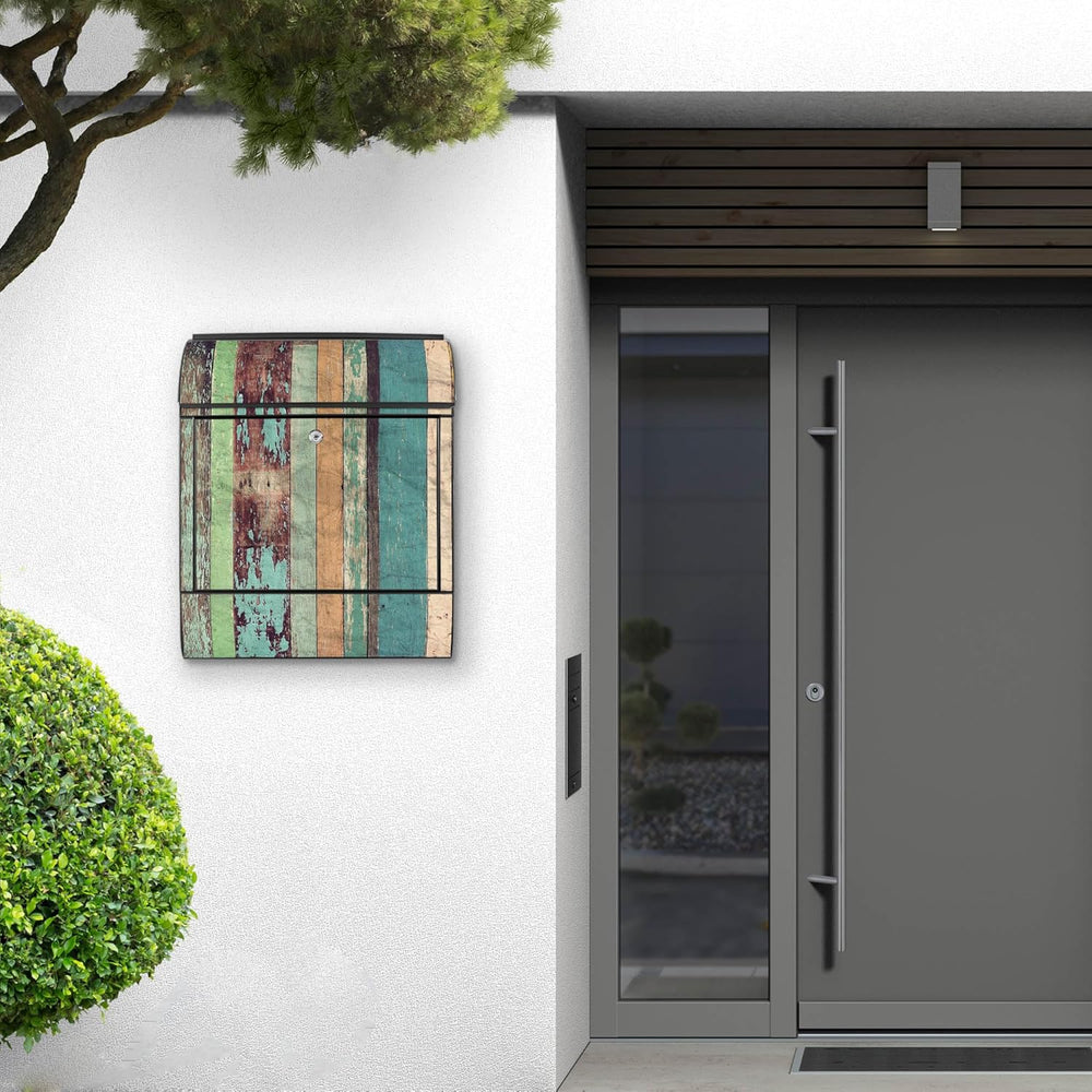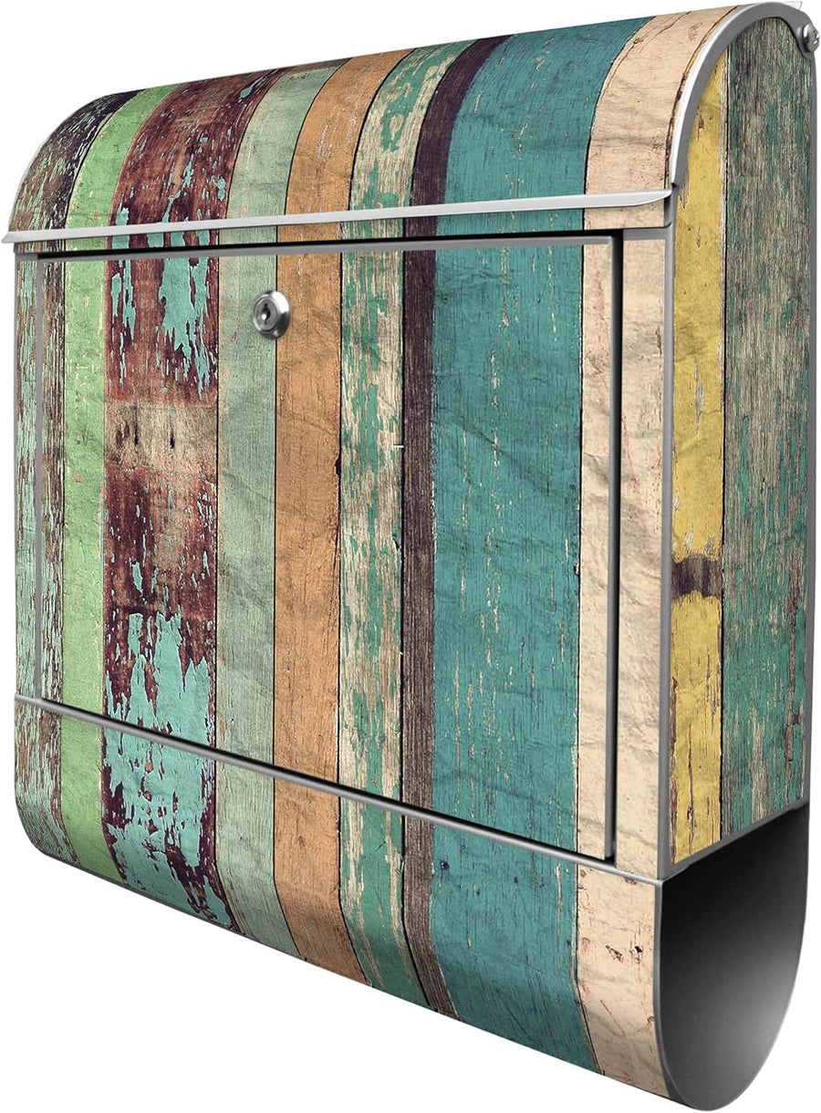 banjado® Design Briefkasten mit Motiv Bunte Bretterwand 39x47x14cm & 2 Schlüssel - Briefkasten Stahl