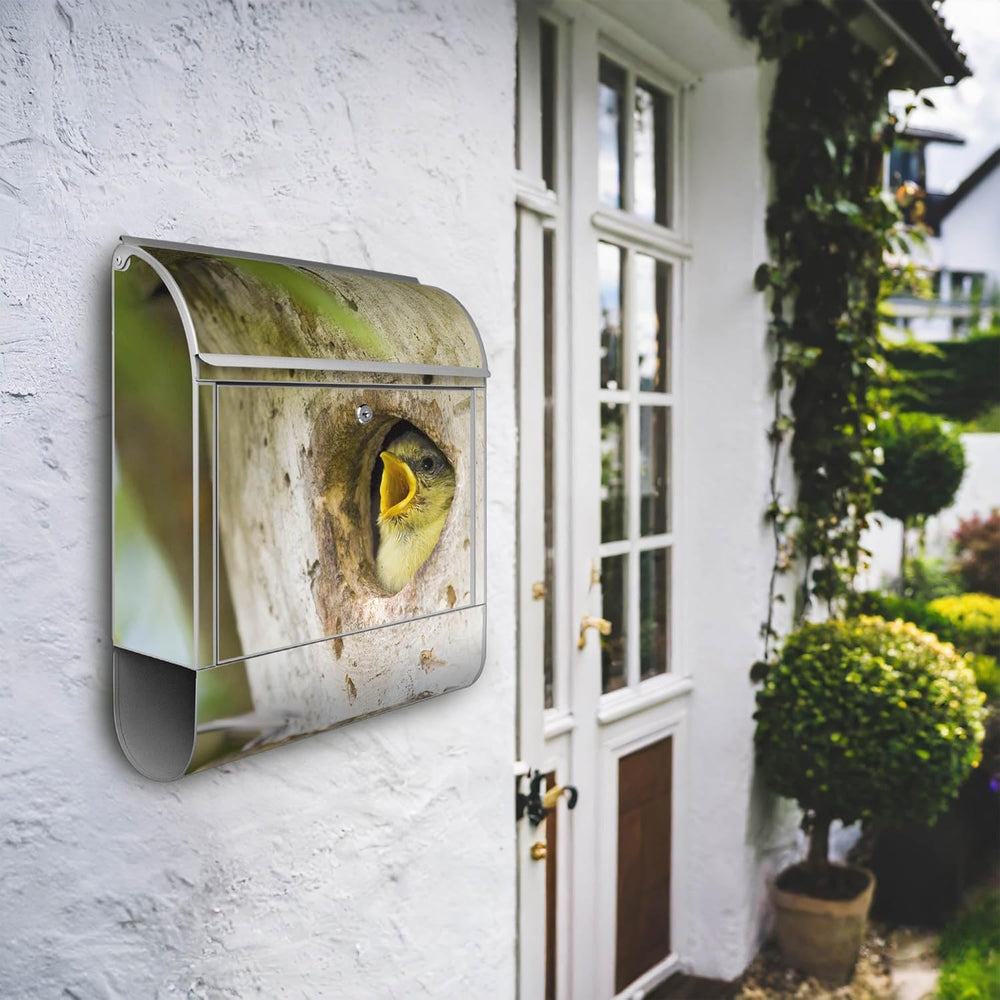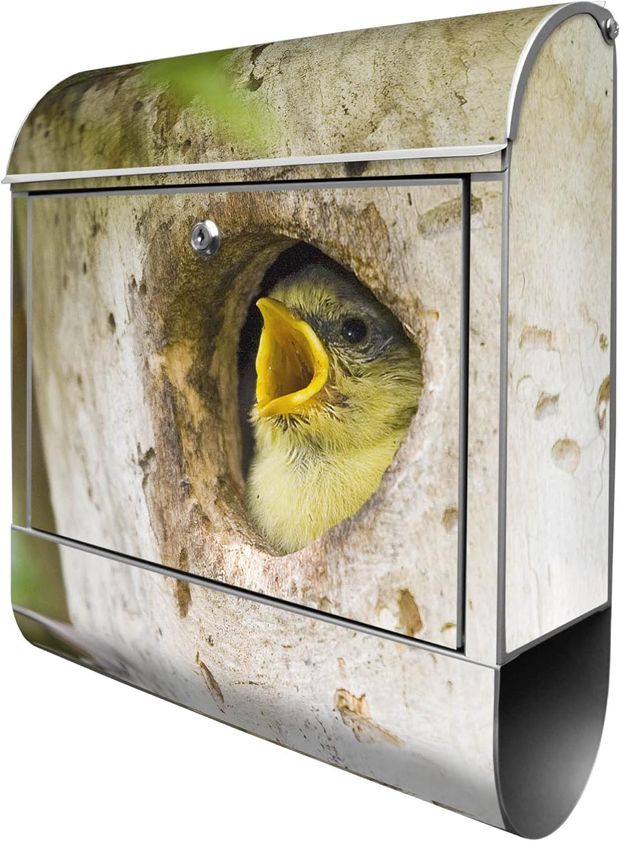 banjado® Design Briefkasten mit Motiv Blaumeise 39x47x14cm & 2 Schlüssel - Briefkasten Stahl Silber