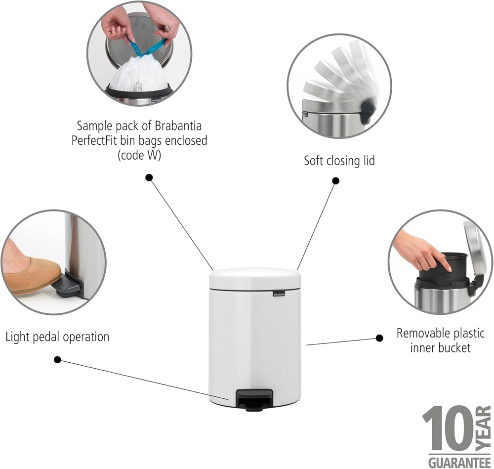 Brabantia Treteimer mit Inneneimer aus Kunststoff, Stahl, 5 Liter, Weiss, 5L 5 Liter White, 5 Liter