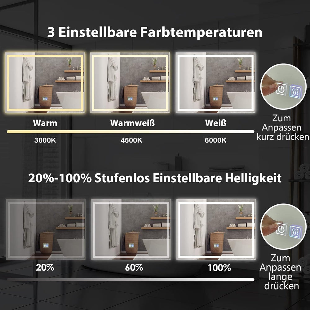 COSTWAY Badspiegel mit Anti-Beschlage Spiegelheizung, LED-Spiegel dimmbar, Badezimmerspiegel 3000K-6