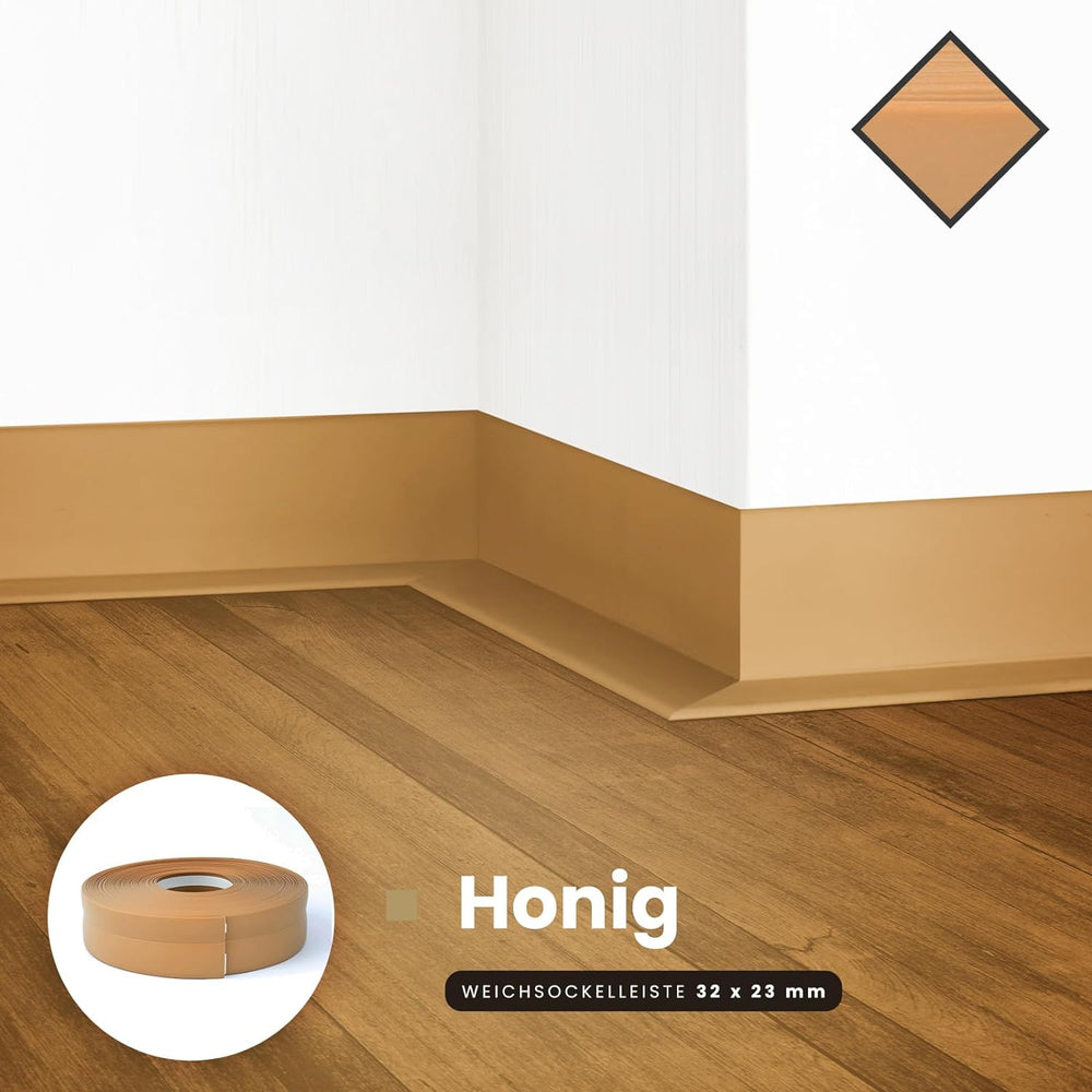 DQ-PP WEICHSOCKELLEISTE | 20m | honig | 32x23mm | PVC | selbstklebend | Knickwinkel Fussleisten Gumm