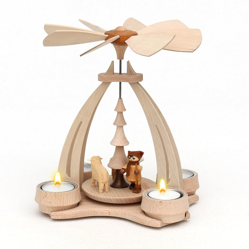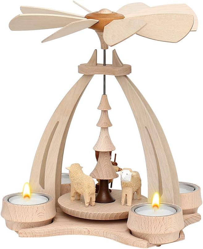 Dekohelden24 Tisch-Pyramide aus Buchenholz mit Schafe und Schäfer, für 4 Teelichte geeignet, L/B/H c