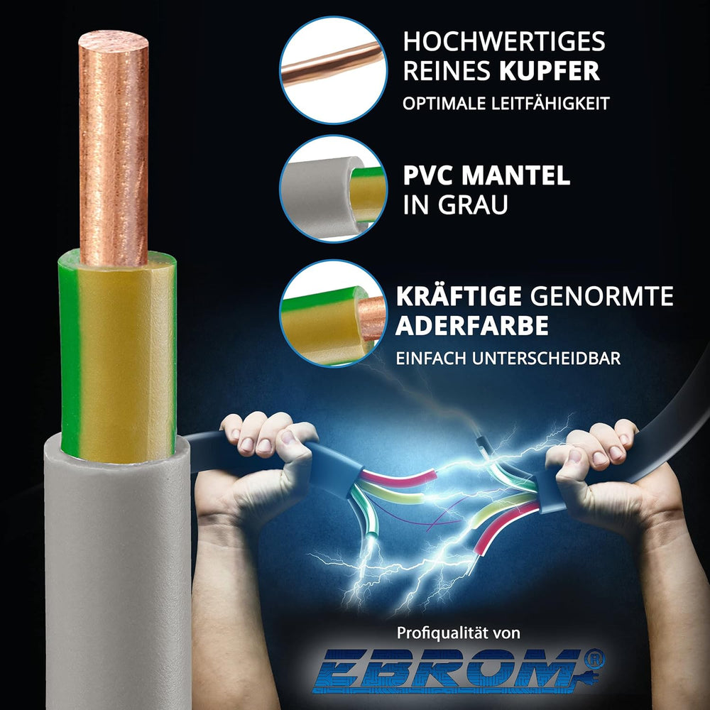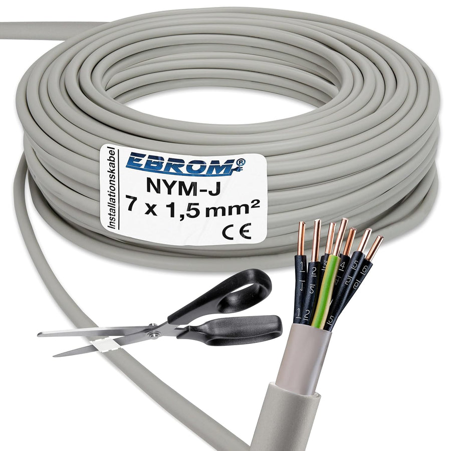 EBROM – NYM-J 7x1,5 mm² (mm2) Mantel GRAU, 7 Litzen FARBIG zur perfekten Zuordnung bei der Installat