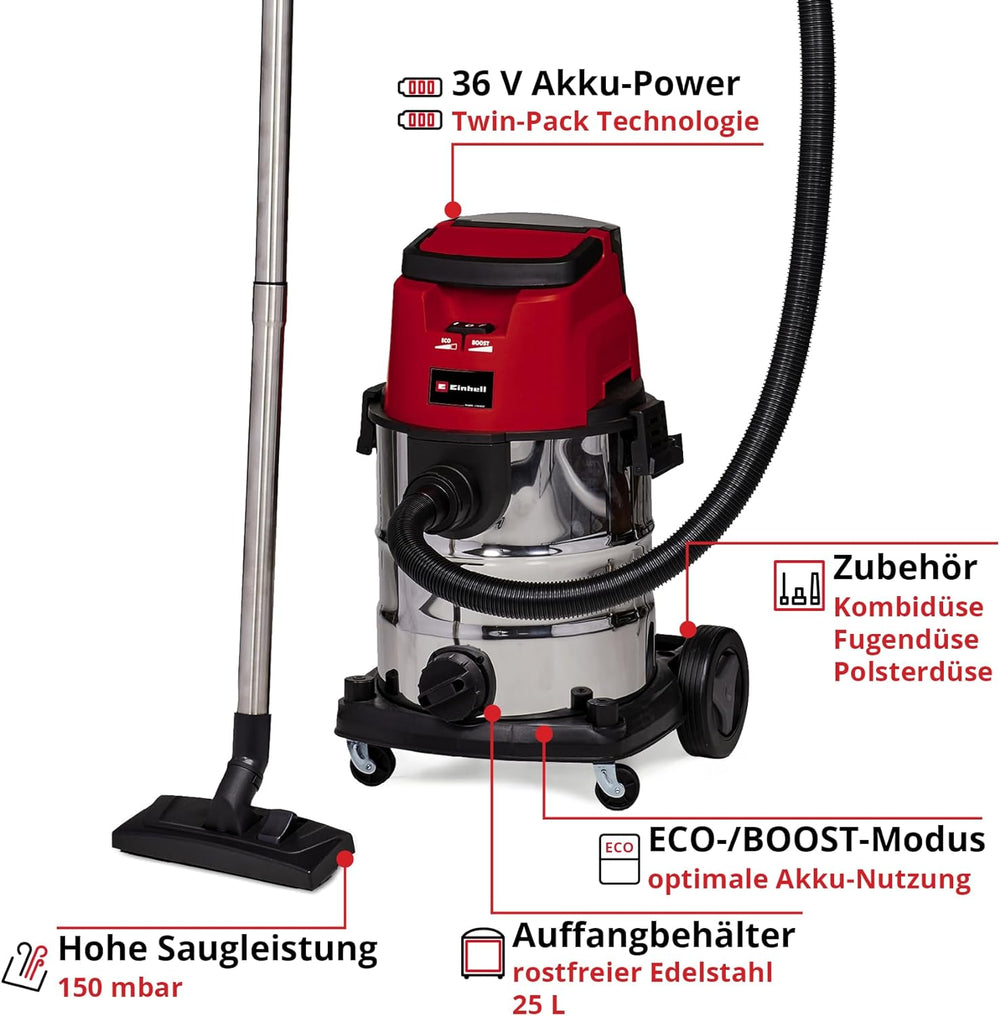 Einhell Akku-Nass-Trockensauger TE-VC 36/25 Li S Power X-Change (Li-Ion, 36 V, ECO/BOOST-Mode, 150 m