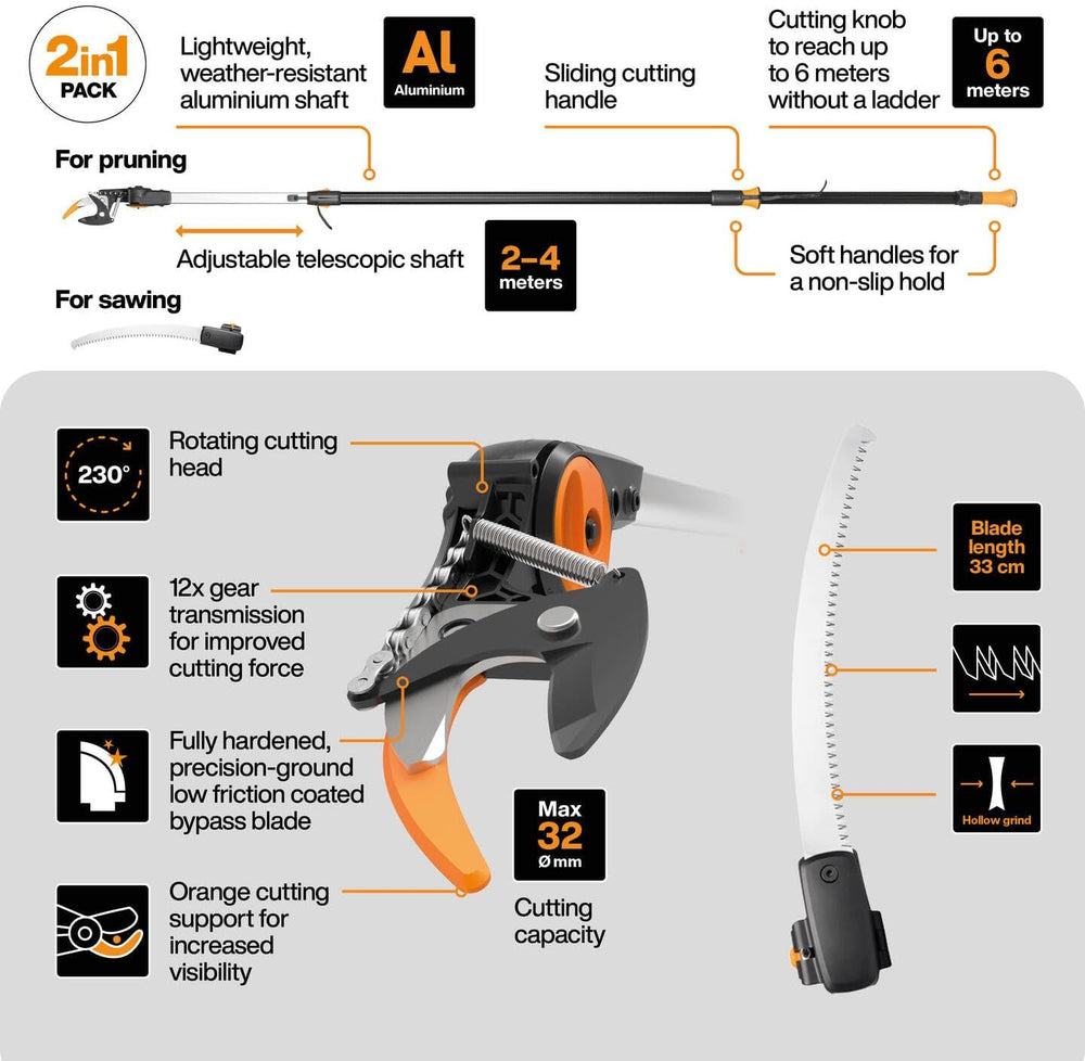 Fiskars Schneidgiraffen-Set, 2-teilig, Bypass Teleskop-Schneidgiraffe UPX86 (Länge 2,4 – 4 m) und Ba
