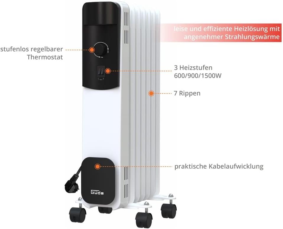 Güde Ölradiator OR 1500-7 (220-240 V, 1500 W Heizleistung, 3 Heizstufen (600/900/1500 W), 7 Rippen,