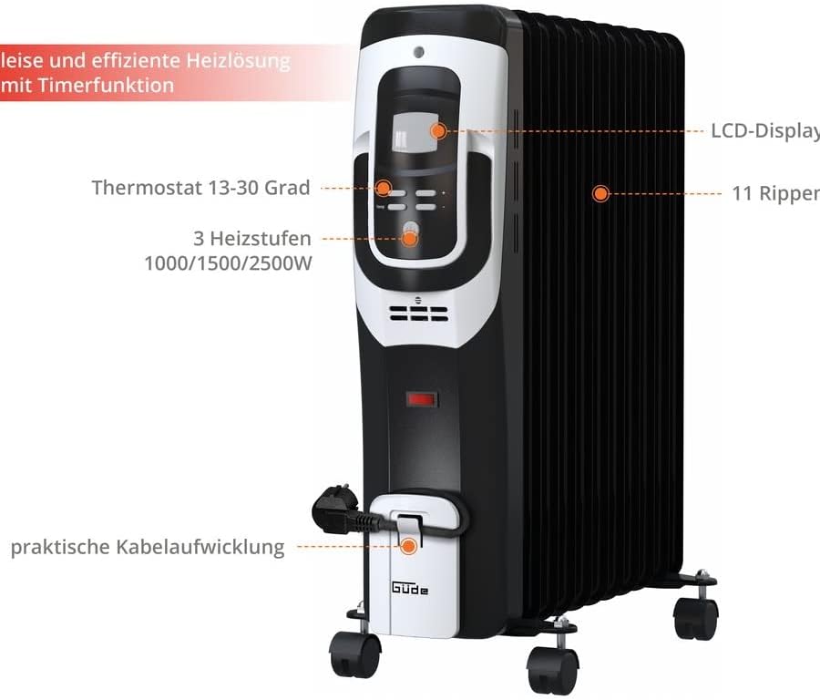 Güde Ölradiator OR 2500-11 DT (2500 W, 3 Heizstufen: 1000/1500/2500 W, 11 Rippen, LCD-Display, Kipp-