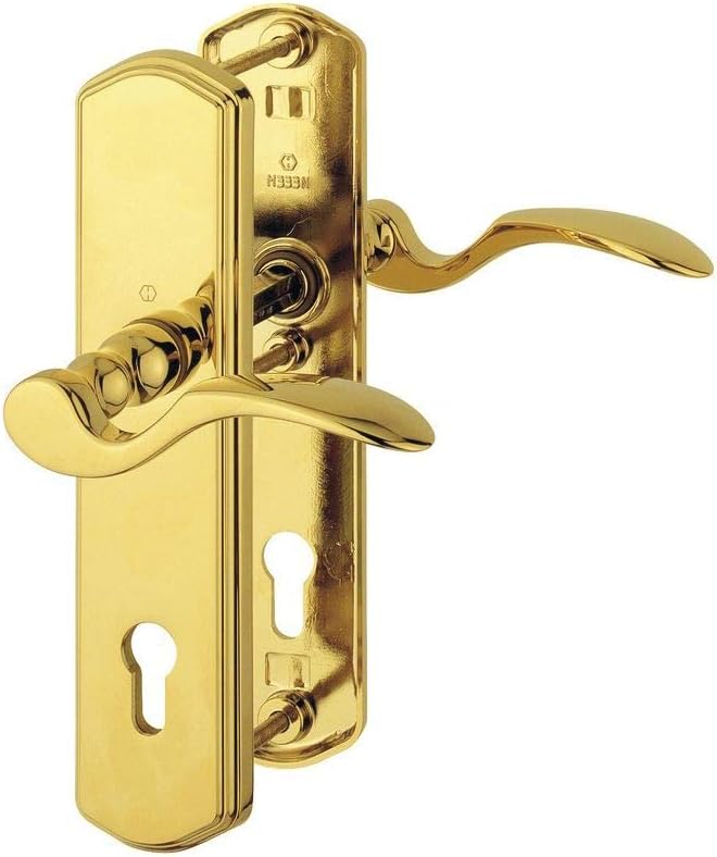 Sicherheits-Drückergarnitur MÜNCHEN - auf Schild PZ92, rechts, Türstärke 77-82, Messing PVD, rechts