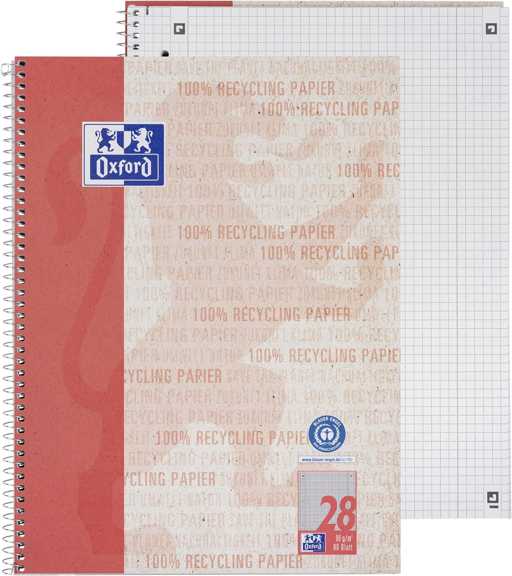 Oxford Recycling Collegeblock A4 kariert mit Doppelrand, 80 Blatt, 10 Stück, A4 kariert mit Doppelra