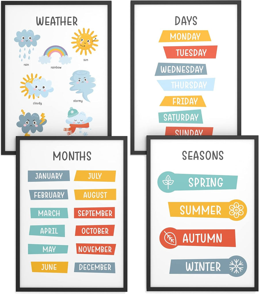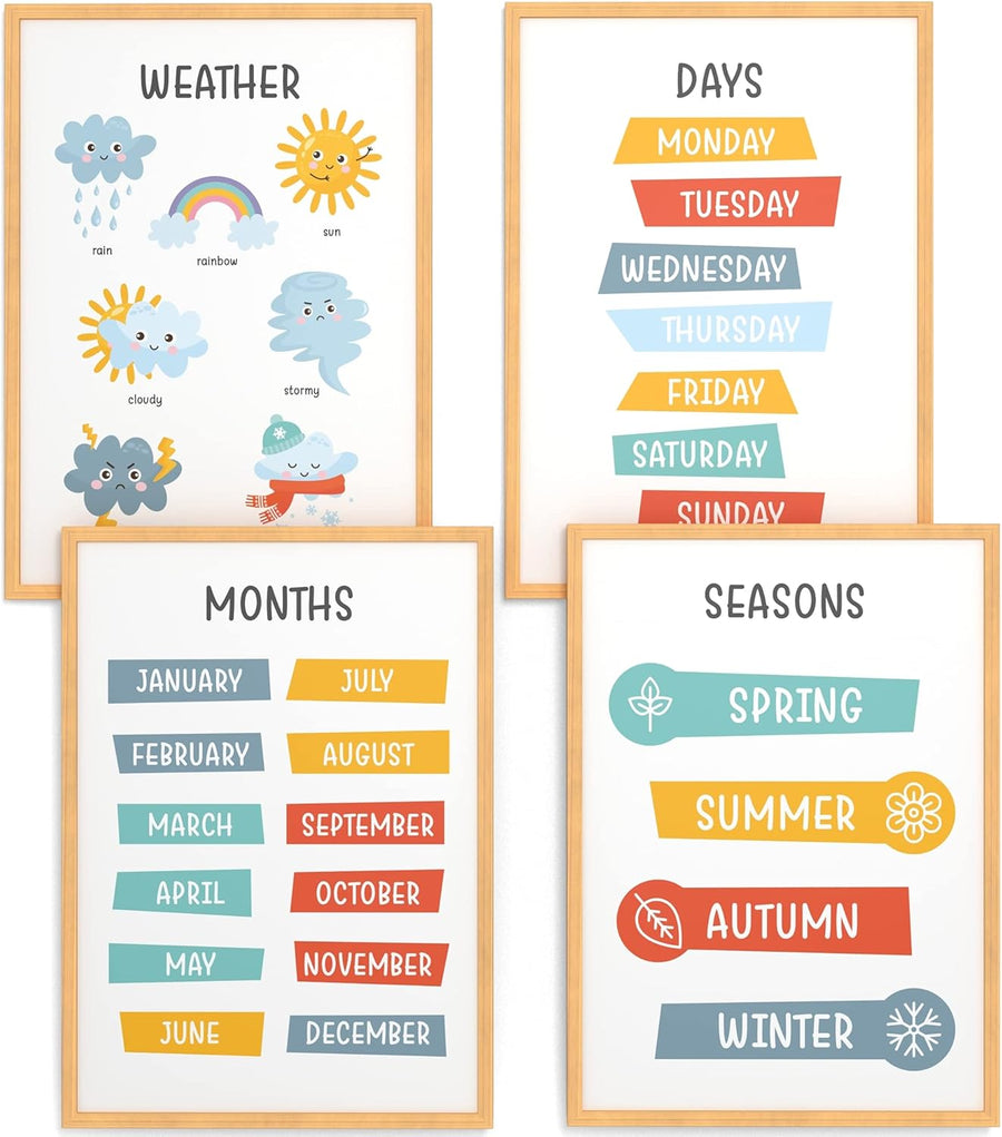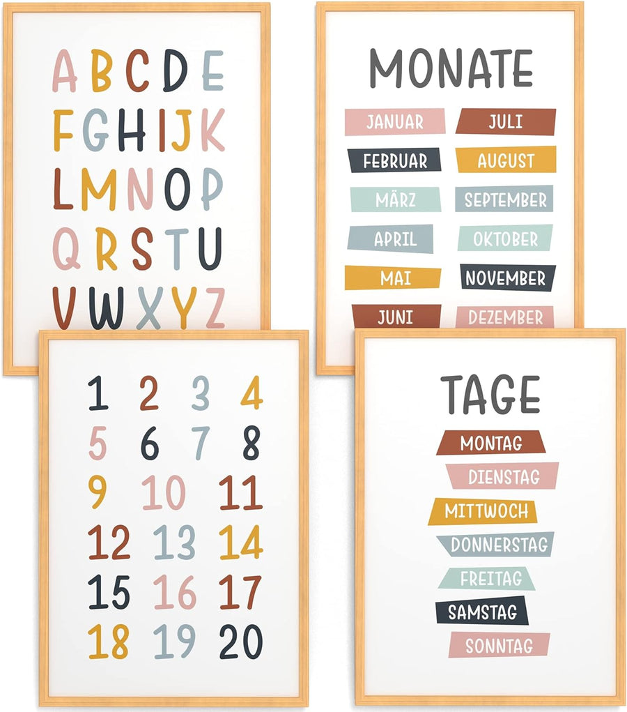 Papierschmiede® Kinderbilder 4er Set Lernposter, A4 gerahmt in Holzrahmen (Natur), Geschenk für Mädc