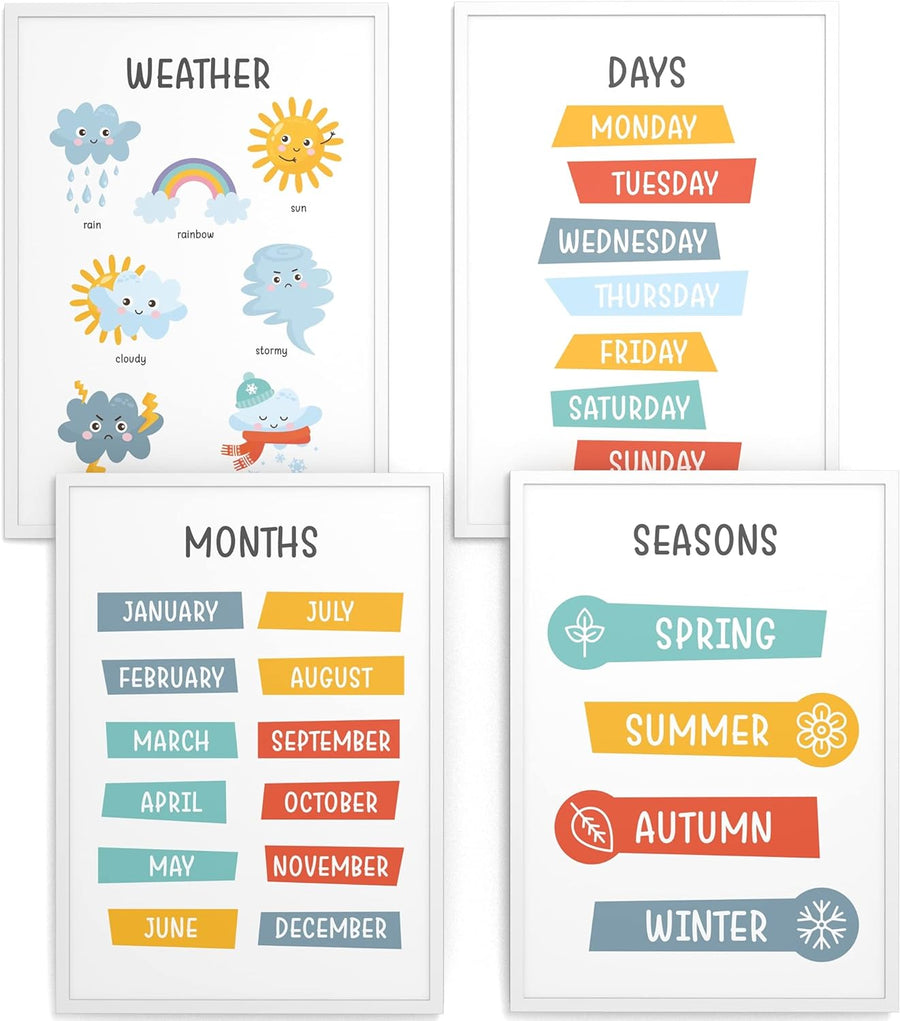 Papierschmiede® Kinderbilder 4er Set Lernposter, A4 gerahmt in Holzrahmen (weiss), Geschenk für Mädc