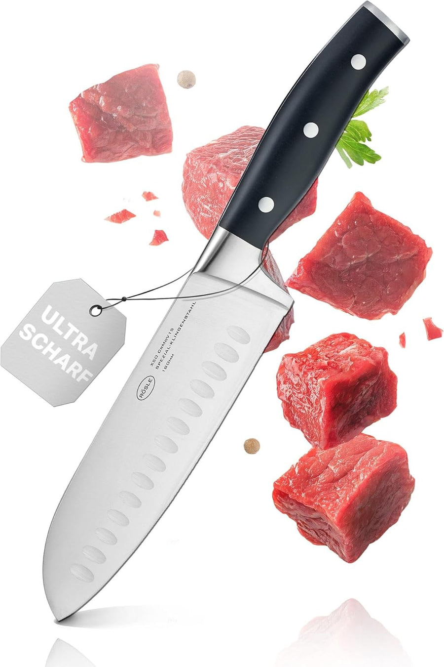RÖSLE Santokumesser Tradition, Hochwertiges Küchenmesser mit Kullenschliff zum feinen Schneiden von