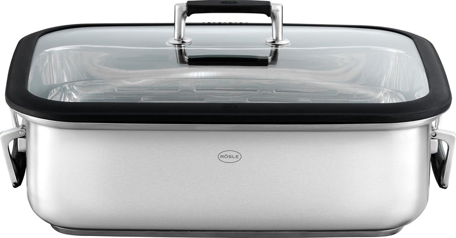 RÖSLE Silence Pro Bräter rechteckig, Hochwertiger Bräter mit Glasdeckel, Edelstahl 18/10, backofenge
