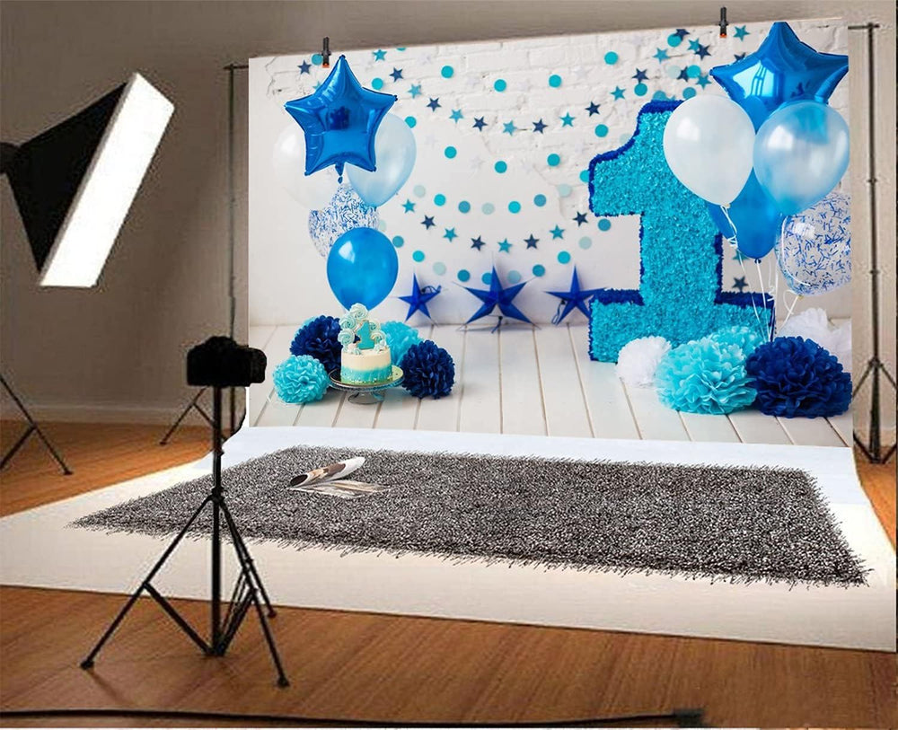 Renaiss 2.7x1.8m Kinder 1. Geburtstag Foto Hintergrund Papier Blumen Blaue Luftballons Holzboden Fot
