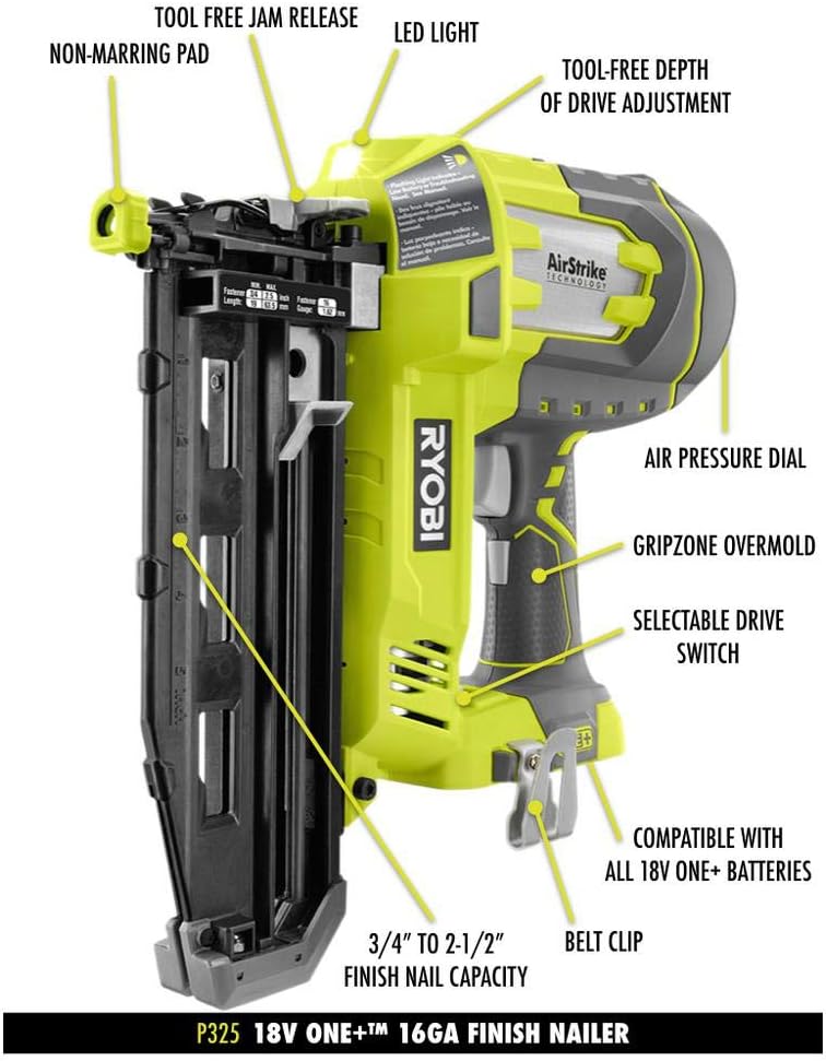 Ryobi P325 One+ 18 V Lithium-Ionen-Akku-betriebener, kabelloser Nagler, 16 Gauge (Batterie nicht im