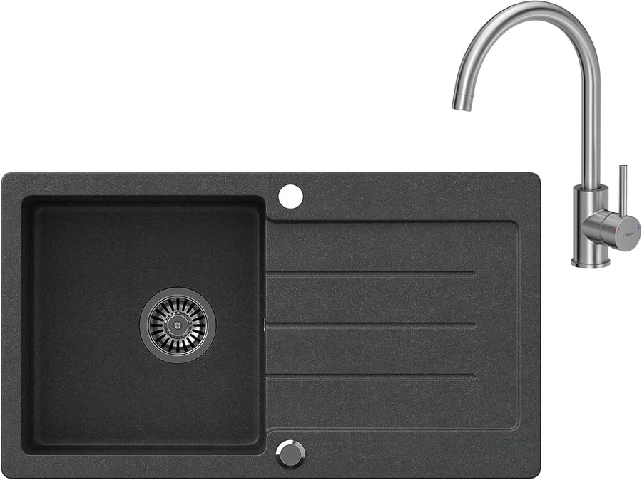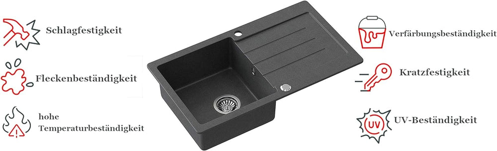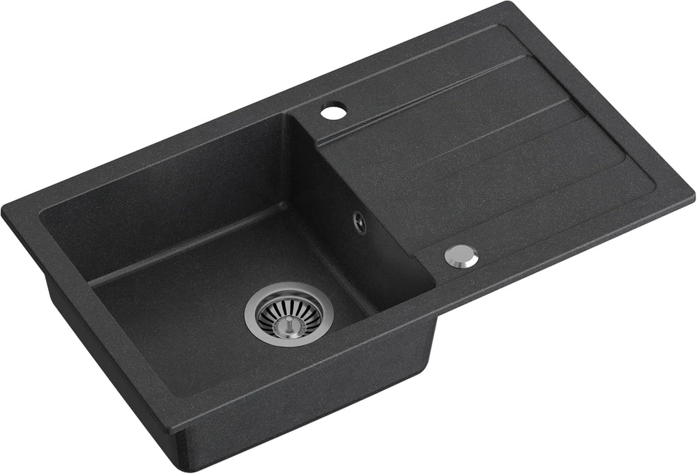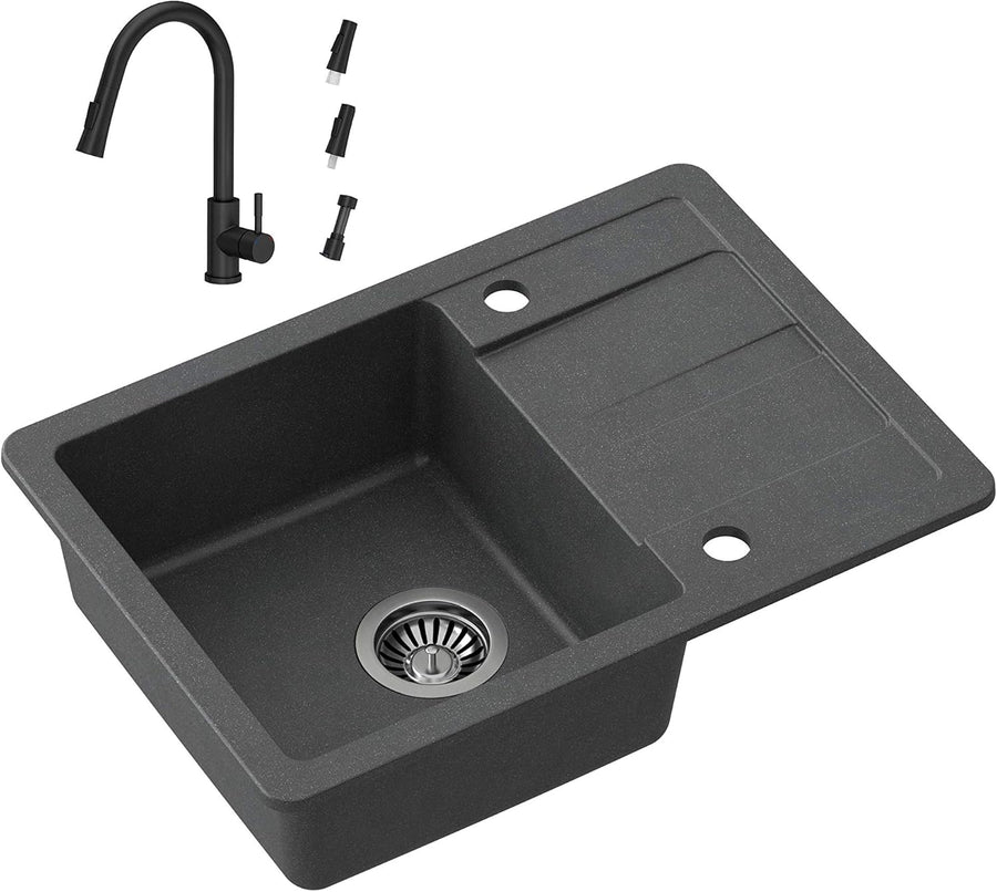 VBChome Spülbecken + Armatur 77 x 44 cm Schwarz Granit Einzelbecken Einbauspüle gesprenkelt reversib