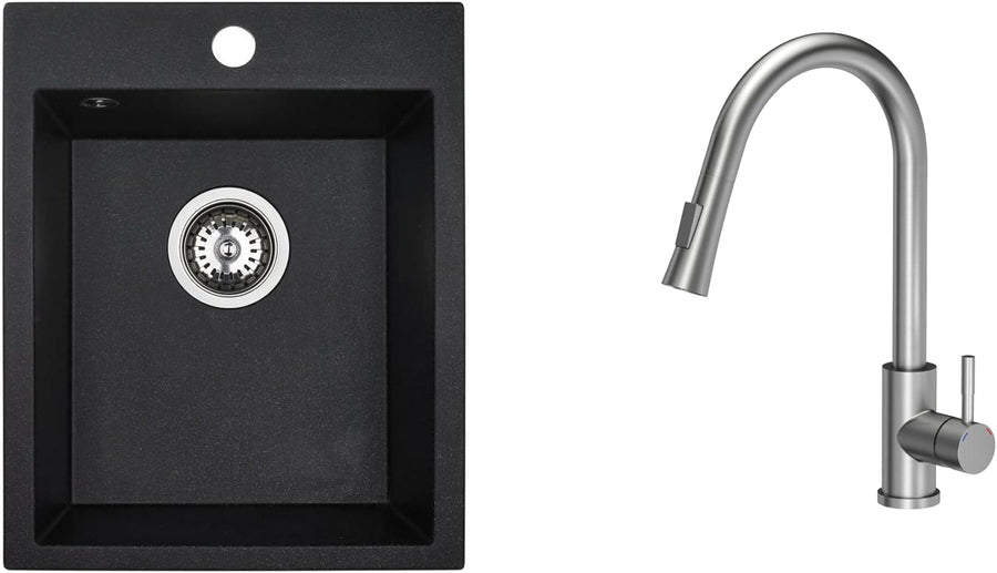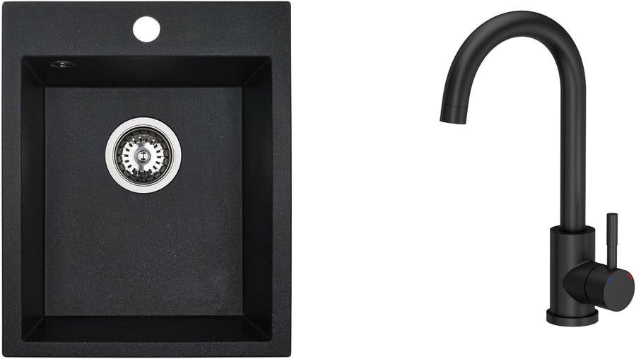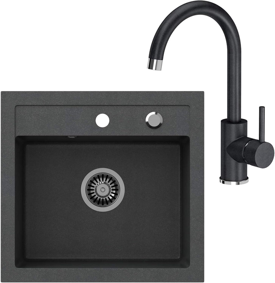 VBChome Spülbecken + Armatur 50 x 47 cm Schwarz Spüle Einzelbecken Küche Einbauspüle Verbundspüle Kü