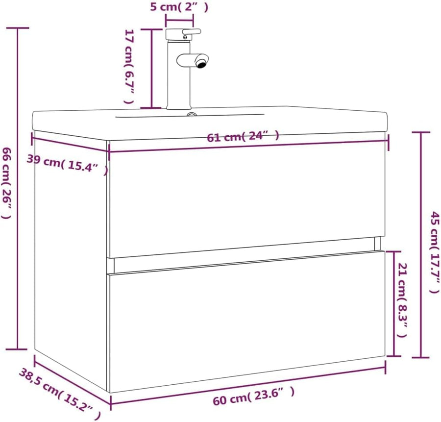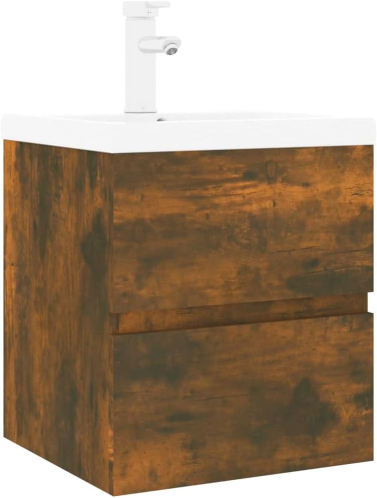 WIFESE Waschbeckenschrank mit Einbaubecken & Wasserhahn 42x39x18,5 cm mit Wasserhahn Räuchereiche Ho