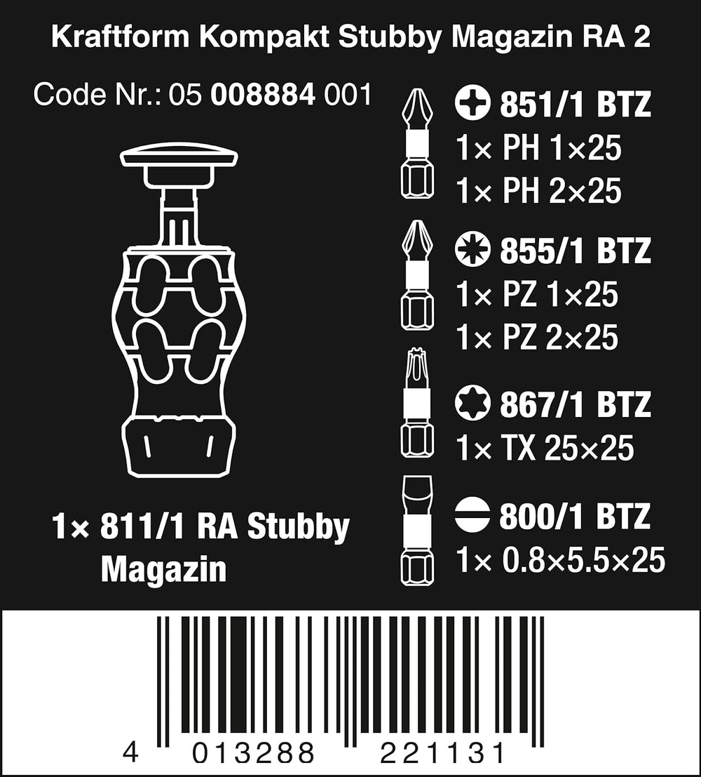 Wera 05008884001 Kraftform Kompakt Stubby Magazin RA 2, Stubby Ratschenschraubendreher mit Bit Magaz