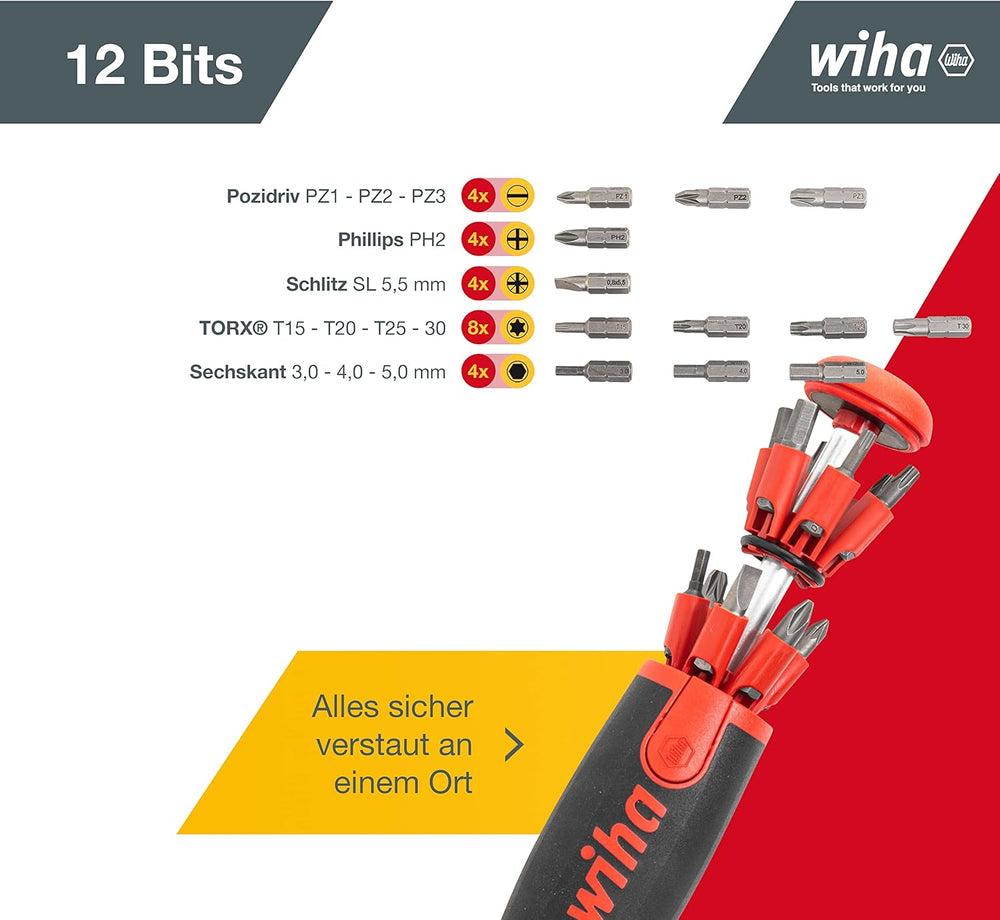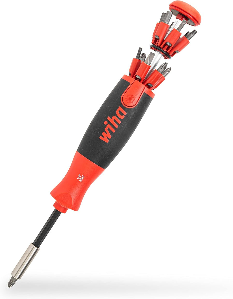 Wiha Schraubendreher mit Bit Magazin LiftUp 25 magnetisch gemischt mit 12 Bits, 1/4" (3803), Bits im