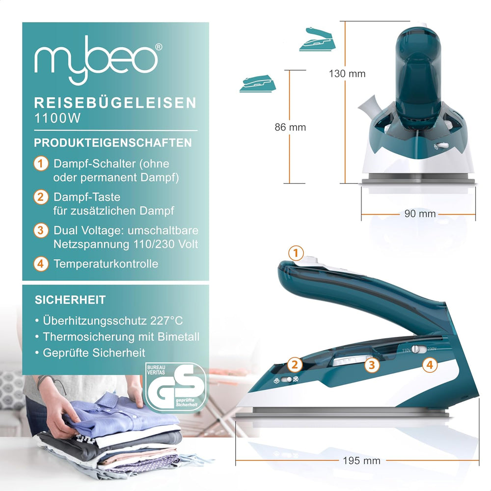 MyBeo - Reisebügeleisen Dampfbügeleisen 1100W - Dual-Voltage 110/230 Volt – mini Bügeleisen mit anti