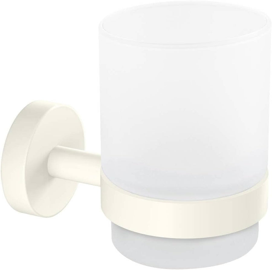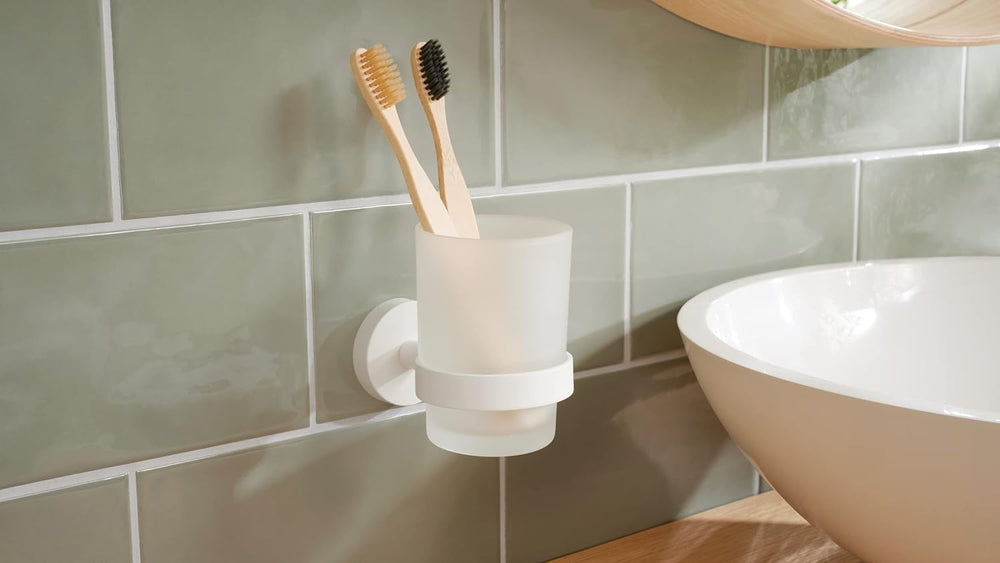 tesa MOON WHITE Zahnputzbecher aus satiniertem Glas mit Halter, matt weiss - für Bäder im Industrial