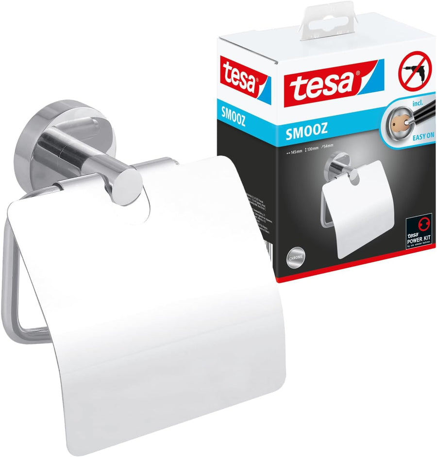 tesa SMOOZ Toilettenpapierhalter mit Deckel, verchromt - WC-Rollenhalter zur Wandbefestigung ohne Bo