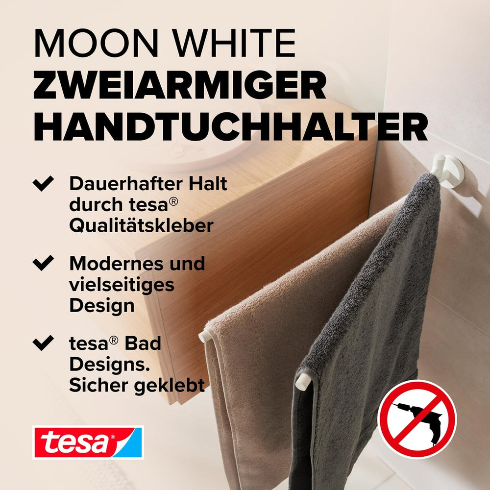 tesa Moon White Doppel-Handtuchstange, matt weiss - Badetuchhalter mit 2 Stangen - zur Wandbefestigu