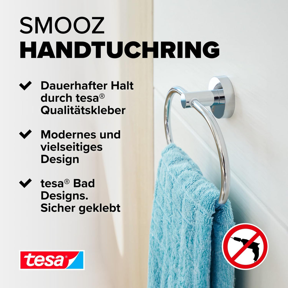 tesa SMOOZ Handtuchring, verchromt - Handtuchhalter-Ring oval - zur Wandbefestigung ohne Bohren, ink