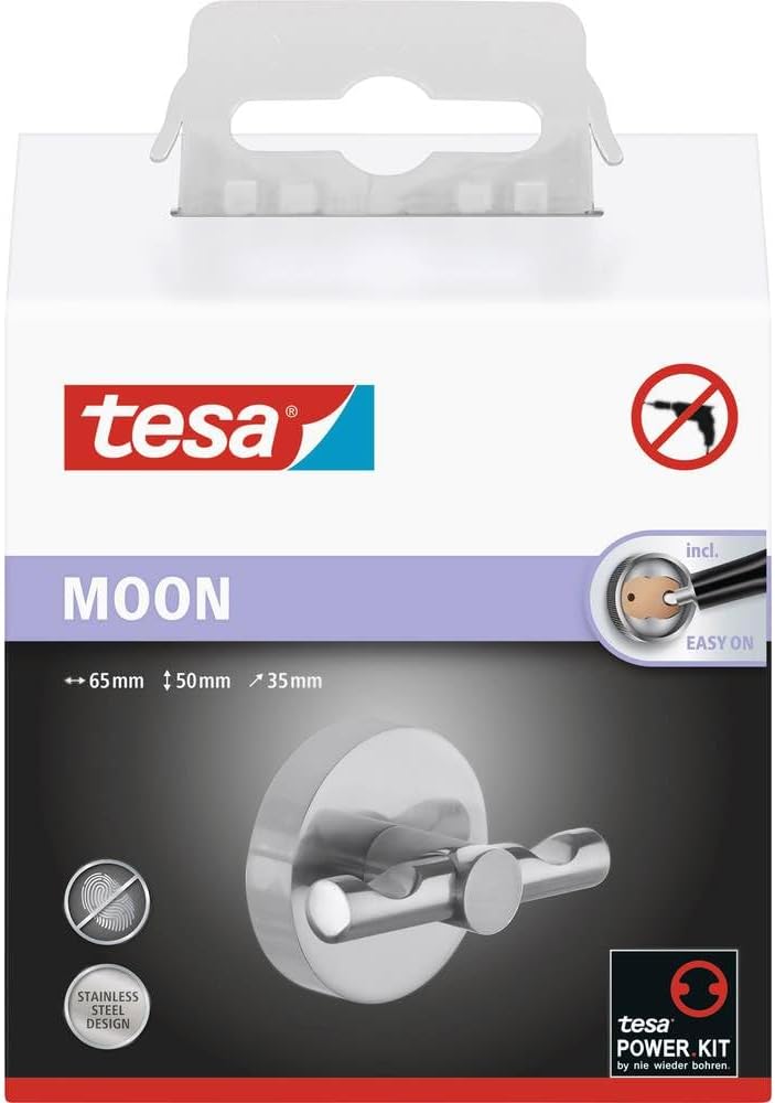 tesa MOON Handtuchhaken, verchromter Edelstahl - Bad-Haken zur Wandbefestigung ohne Bohren, inkl. Kl