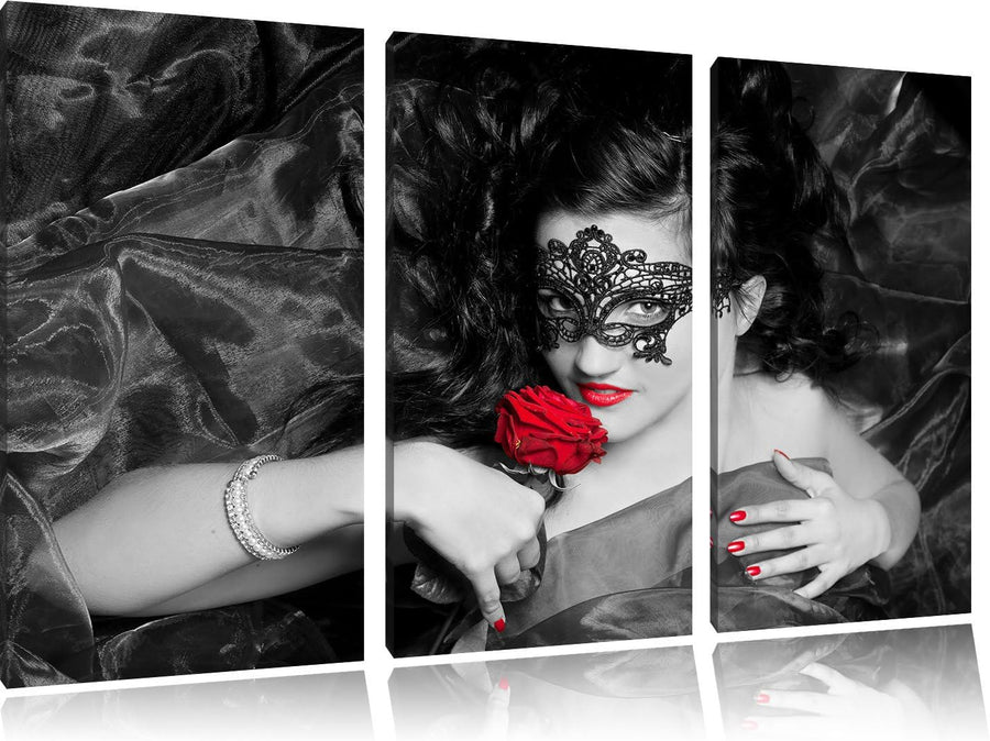 Maskierte Lady mit Rose schwarz/weiss 3-Teiler Leinwandbild 120x80 Bild auf Leinwand, XXL riesige Bi