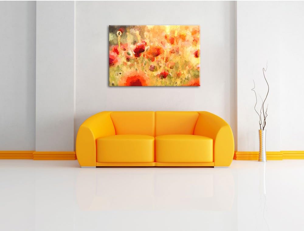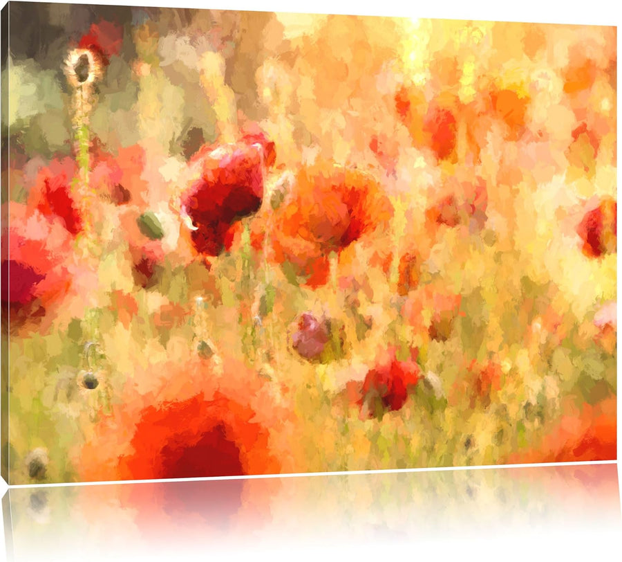 Mohnwiese Pinsel Effekt, Format: 100x70 auf Leinwand, XXL riesige Bilder fertig gerahmt mit Keilrahm