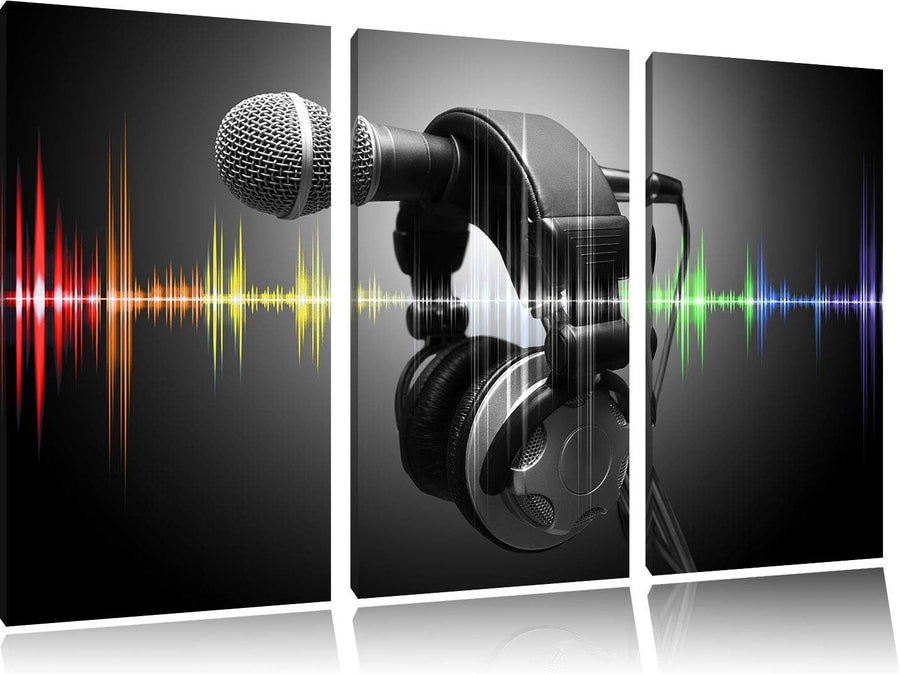 Mikrofon mit Kopfhörern auf Mikrofonständer schwarz/weiss 3-Teiler Leinwandbild 120x80 Bild auf Lein