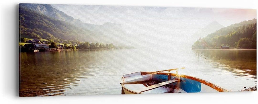 Panorama Bilder auf Leinwand Berge See Boot Leinwandbild mit Rahmen 90x30cm Wandbilder Dekoration Wo