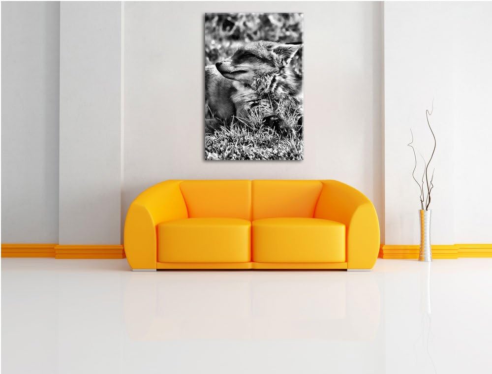 Monocrome, Fuchs im Gras, Format: 100x70 auf Leinwand, XXL riesige Bilder fertig gerahmt mit Keilrah