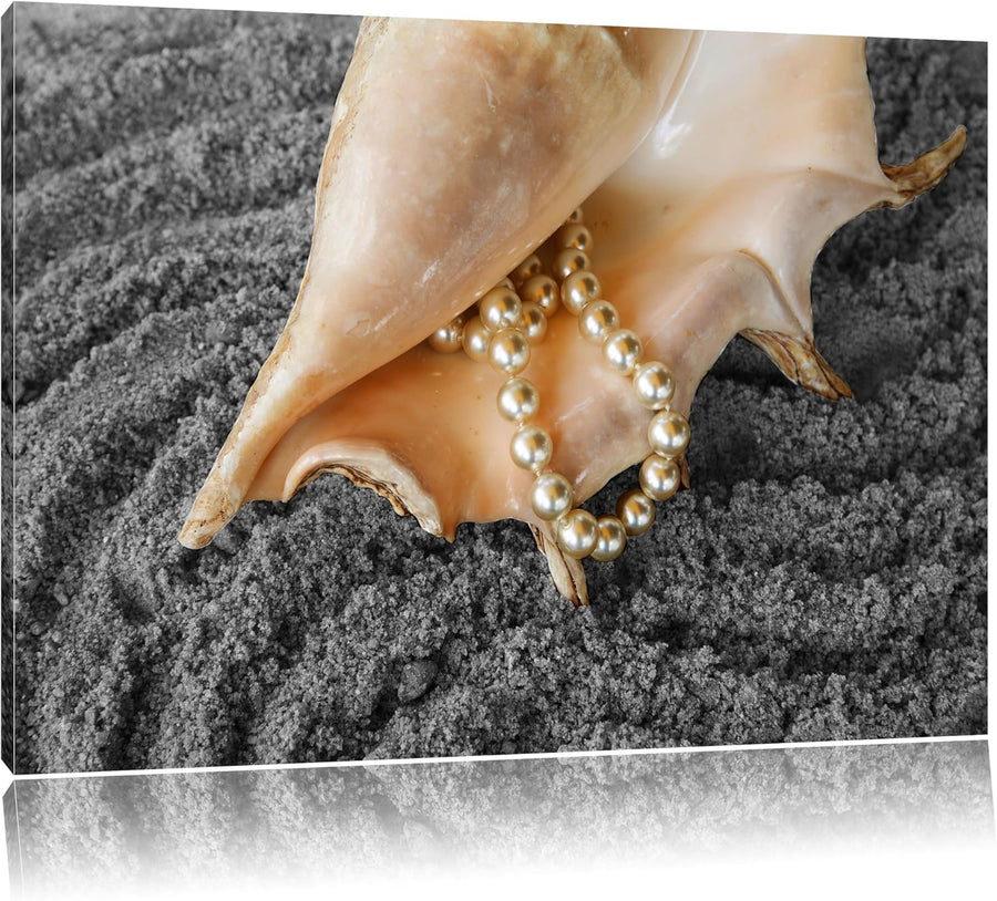 Muschel mit Perlenkette im Sand schwarz/weiss Format: 100x70 auf Leinwand, XXL riesige Bilder fertig