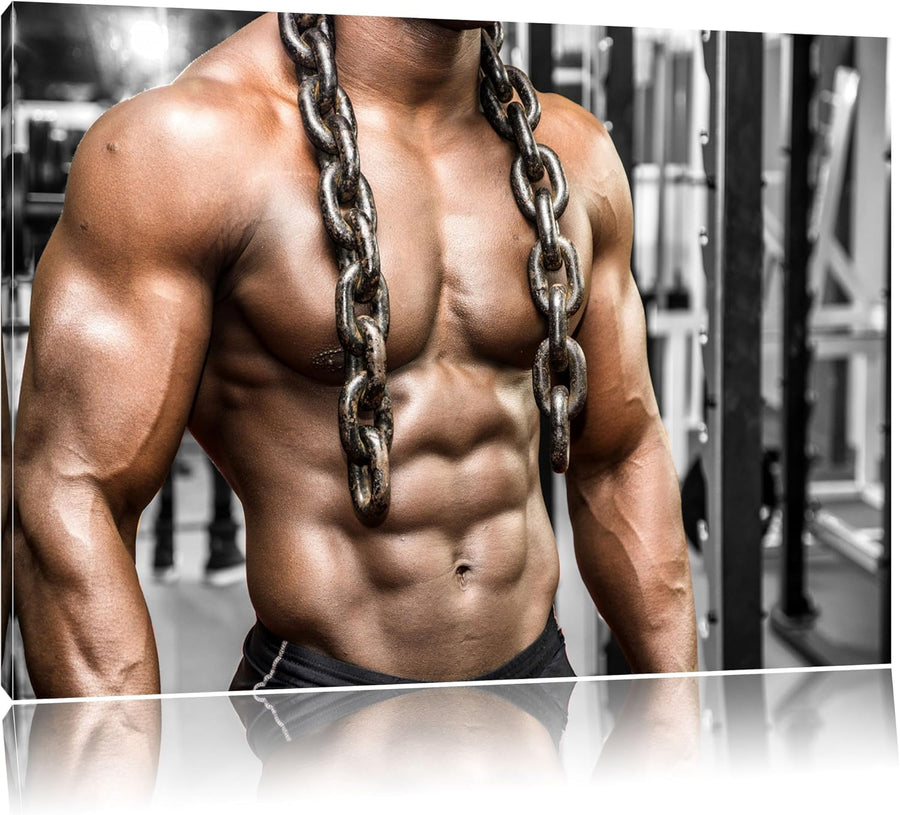 Muskelpaket mit Kette schwarz/weiss Format: 100x70 cm auf Leinwand, XXL riesige Bilder fertig gerahm